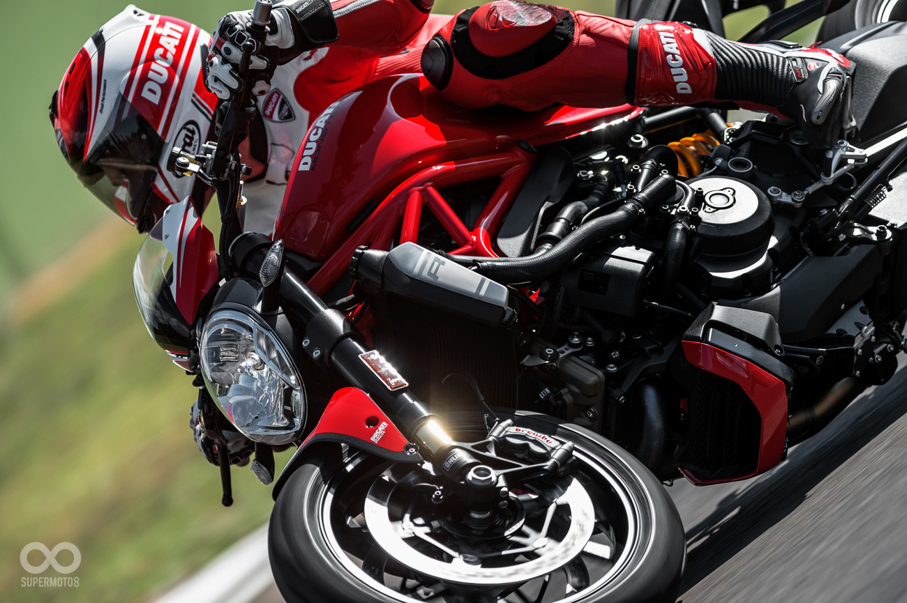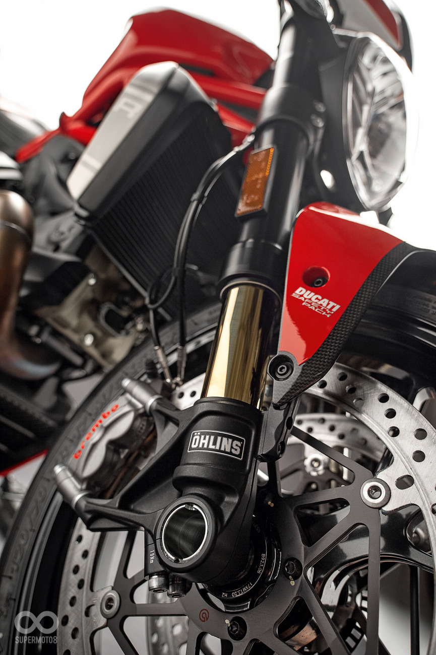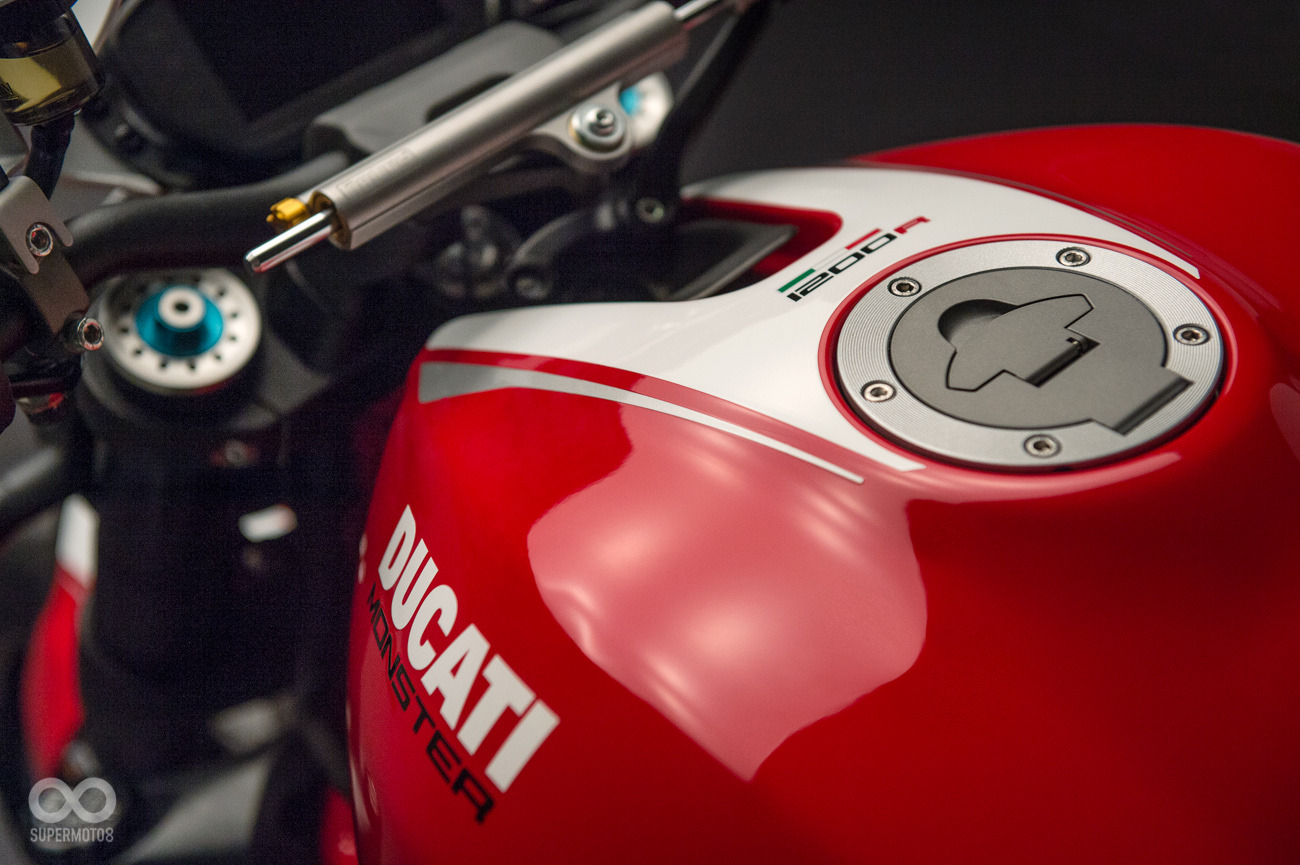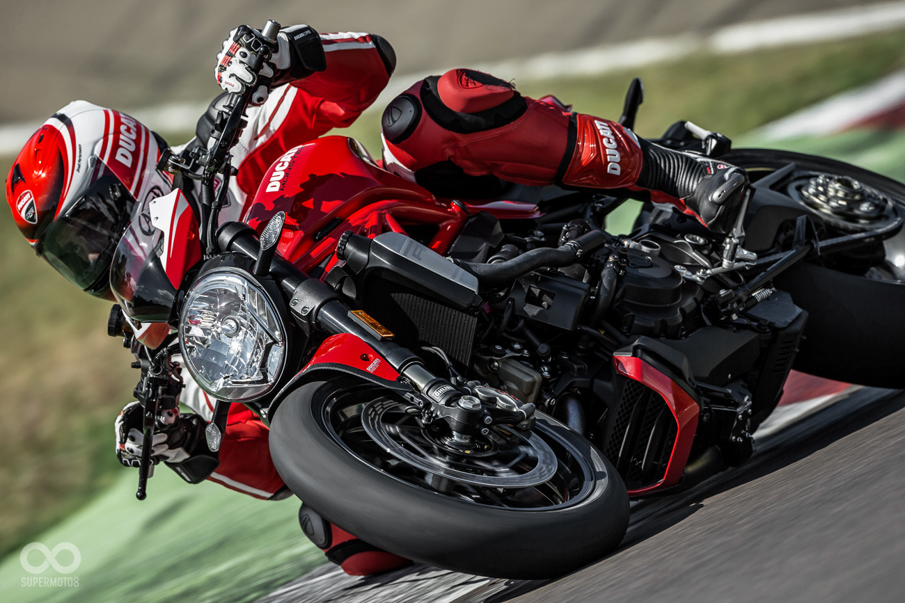 對應更強悍的性能,Monster 1200 R騎乘姿勢、懸吊與煞車系統也全面強化。因副車架造型的調整,後座提高2cm,搭配全新前後腳踏板設計,騎乘姿勢將更具戰鬥性。導入全新Ohlins前後避震器,採用氮化鈦塗層鍍色,黑金配色為車身外觀造型帶來全新亮點。除了煞車系統導入Brembo M50四活塞輻射卡鉗,對應前330mm、後245mm碟盤直徑,配上Pirelli目前運動胎旗艦Diablo Supercorsa,前後輪胎尺碼分別為120/70 ZR17與200/55 ZR17。同時,Monster 1200 R也導入了Ducati安全套件,包含循跡系統、提供Sport/Touring/Urban三種等級的騎乘模式等。