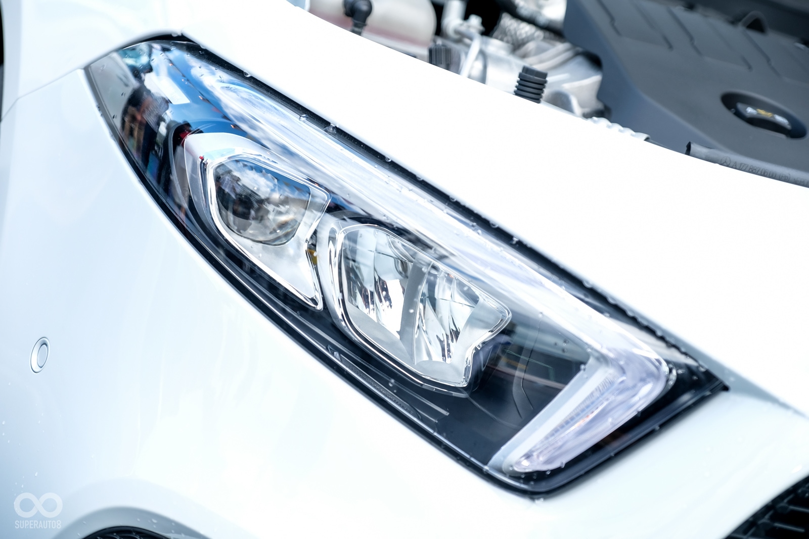 除了因尺碼放大而帶來更具份量感與氣勢的視覺感受以外,The new A-Class 的外觀造型也帶來了全新感受,前傾式車頭的搭配 A 字型前臉設計與鑽石格紋水箱護照,而兩側銳角上揚的頭燈不僅具備 LED 高性能照明科技,更有高辨識度的火炬式日行燈。車側線條更為俐落,不僅以極簡化車身線條帶來流暢美感,也將後視鏡移至車門腰線上,優化了 A 柱的駕駛視線,並於前輪前方導入車側導流氣孔。