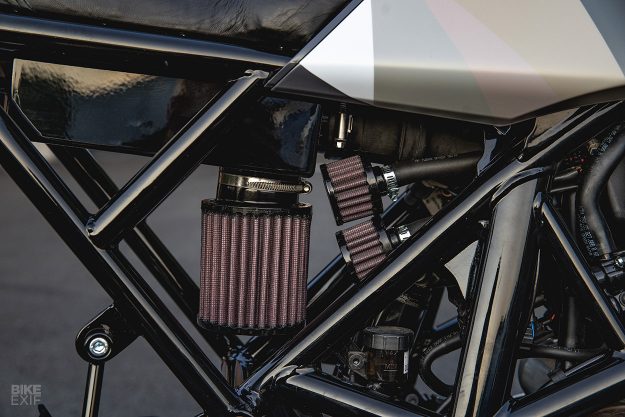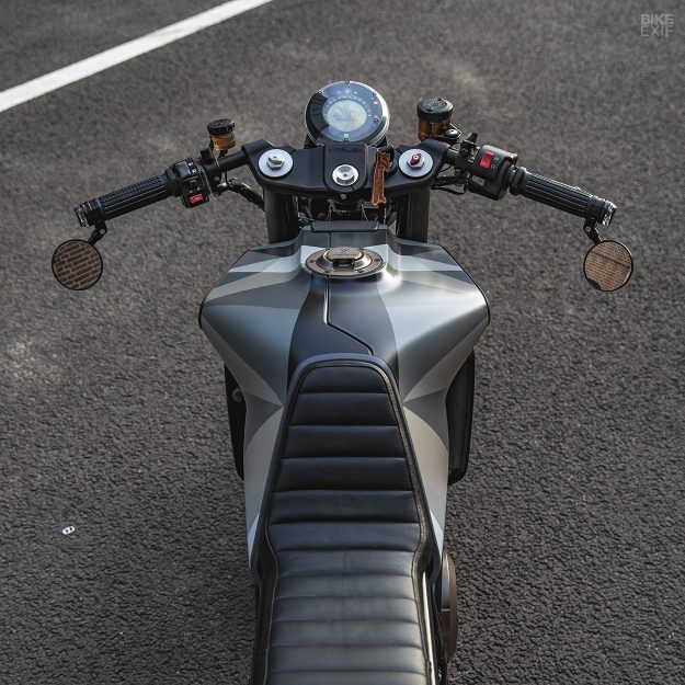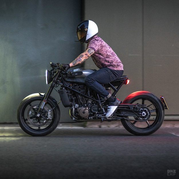 這一次的改造工程與一般我們印象中的Café Racer改裝不太一樣,一般我們經常看到無論是經典運動街車或是頂級運動跑車,總是會淪落到該拆的拆,要拔的拔的極端狀況。但VITPILEN不需要如此。對於VITPILEN僅需要在原有的框架當中去強調一些特色與個性,小雕小琢便成氣侯的輕而易舉著實令人訝異。「總的來說,就算被改裝過,VITPILEN依然必須被一眼辨識出他是一台VITPILEN,」Arjan說到,「我們僅就VITPILEN的風格讓他變得更加前衛,油箱造型與輪框式樣等等的微調,讓你可以一眼辨認出這是一台VITPILEN,但卻又如此的獨一無二。」