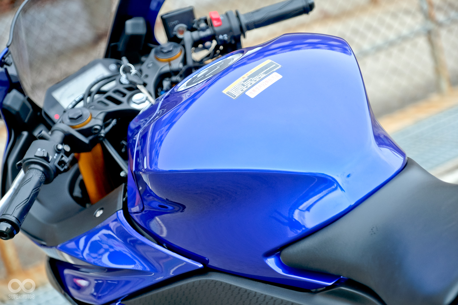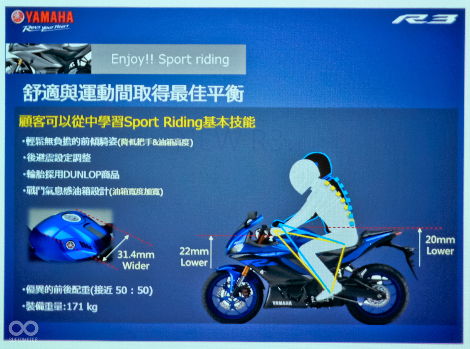 點開網路討論區有關舊款YZF-R3的文章,不外乎許多騎士對於他的運動表現感到懷疑,透過高度降低22mm的下置分離把,一坐上車即可感受到騎士重心較為前傾。入檔轉下油門出發後,新設計的油箱罩除了擁有競技造型外,挾持感同樣有明顯提升。