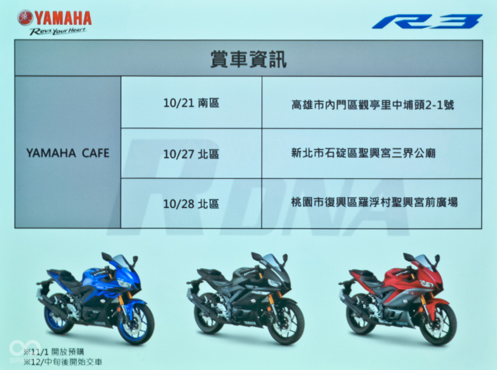 你以為這樣就足夠嗎?距離發表會6天後,台灣山葉直接移師麗寶卡丁車場舉行盛大的2019 YAMAHA YZF-R3發表暨媒體試乘會,並於11/1預購起跑,12月交車,這種進口車引進速度是目前前所未見的,較為可惜的是並未同場公布建議售價。