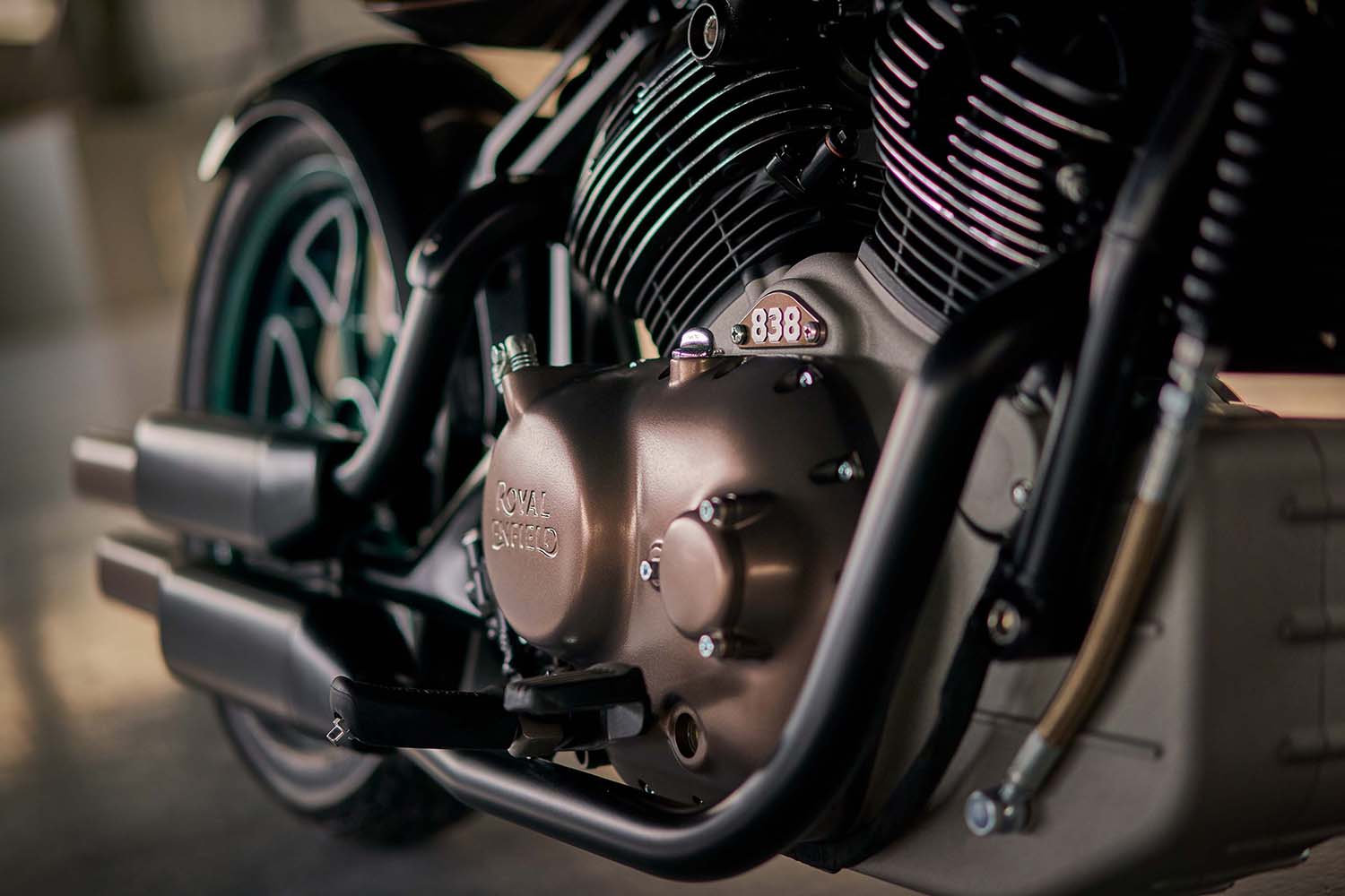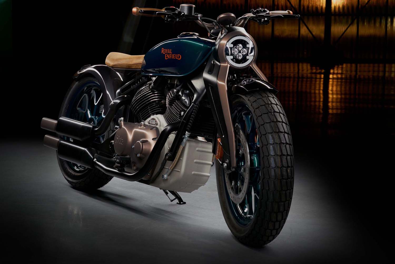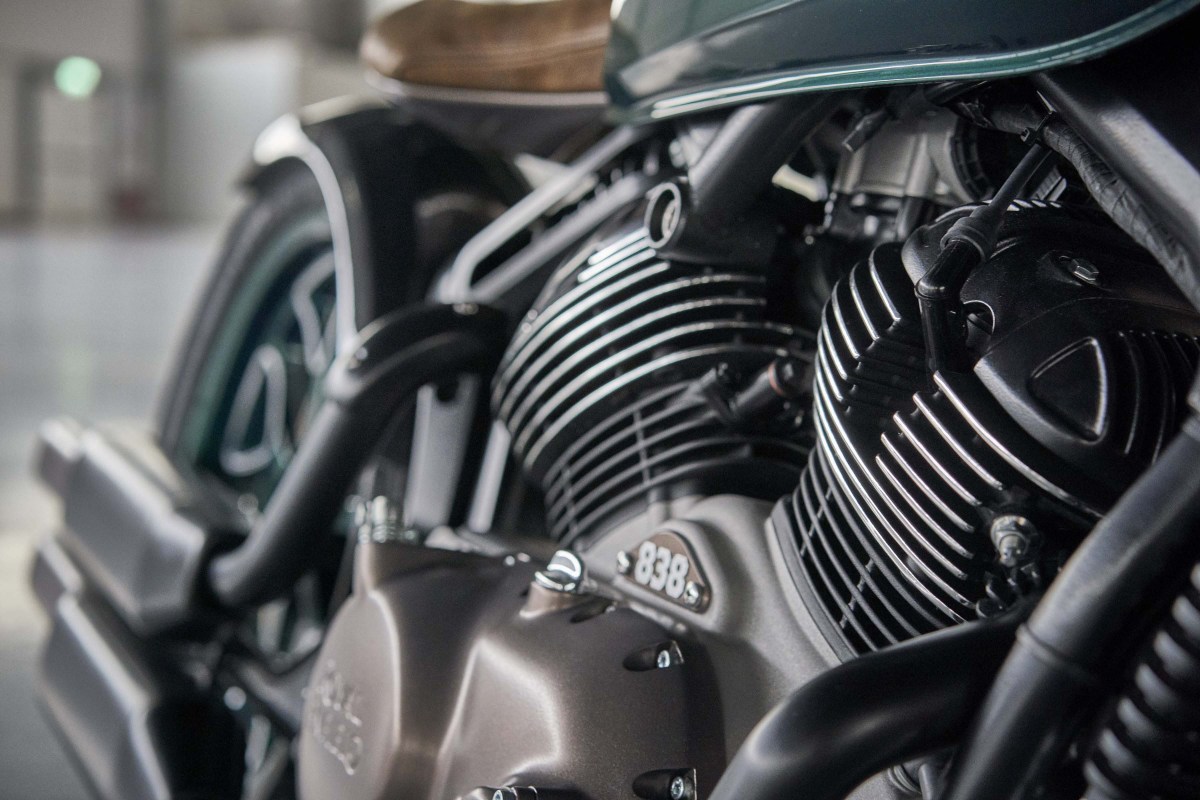 在輪胎上也能看到Royal Enfield替這輛KX概念車裝上了Brembo的卡鉗來替那具比例龐大的838cc 油冷V型雙缸引擎,雖然Royal Enfield並沒有透露更多相關的消息,不過從先前Royal Enfield提過的未來展望看來,這具引擎非常有可能會在近年出現在Royal Enfield的市售車款上。