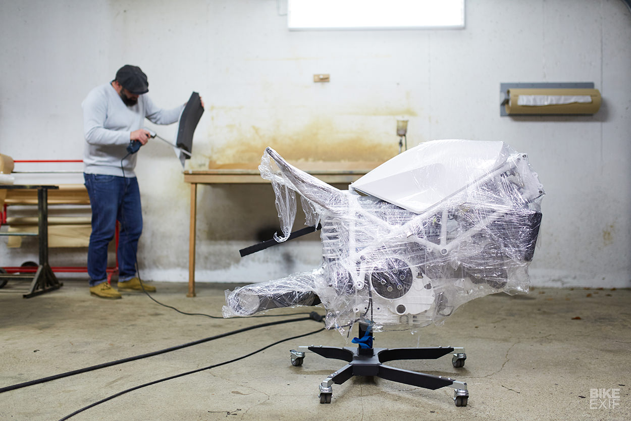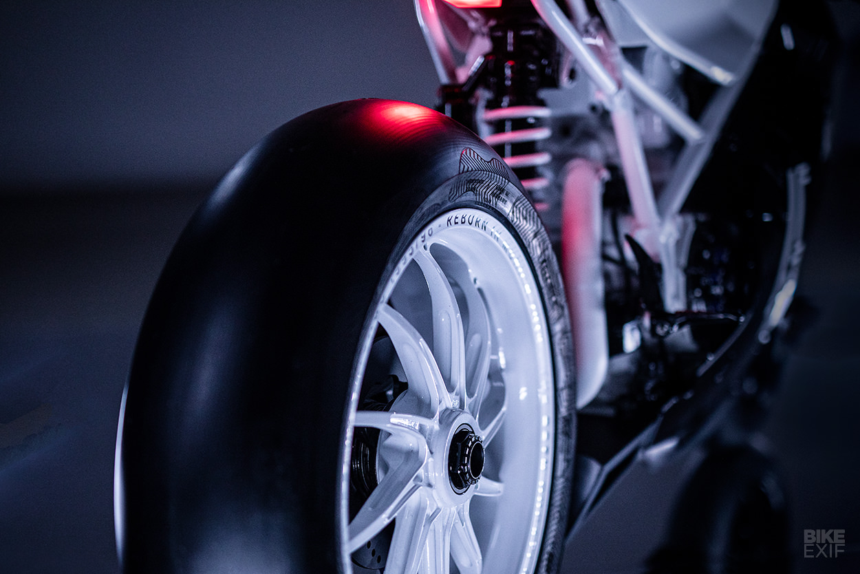 拆除了車架是必然的,為了到合乎要求的造型,鎖點也必須重新打理。一個月後,緊接在車架工作後的是電控設備的調整。電控設備來自Motogadget,Magura提供了可調整的HC3徑向主缸,並連接ABM Steelflex剛性煞車線套件。