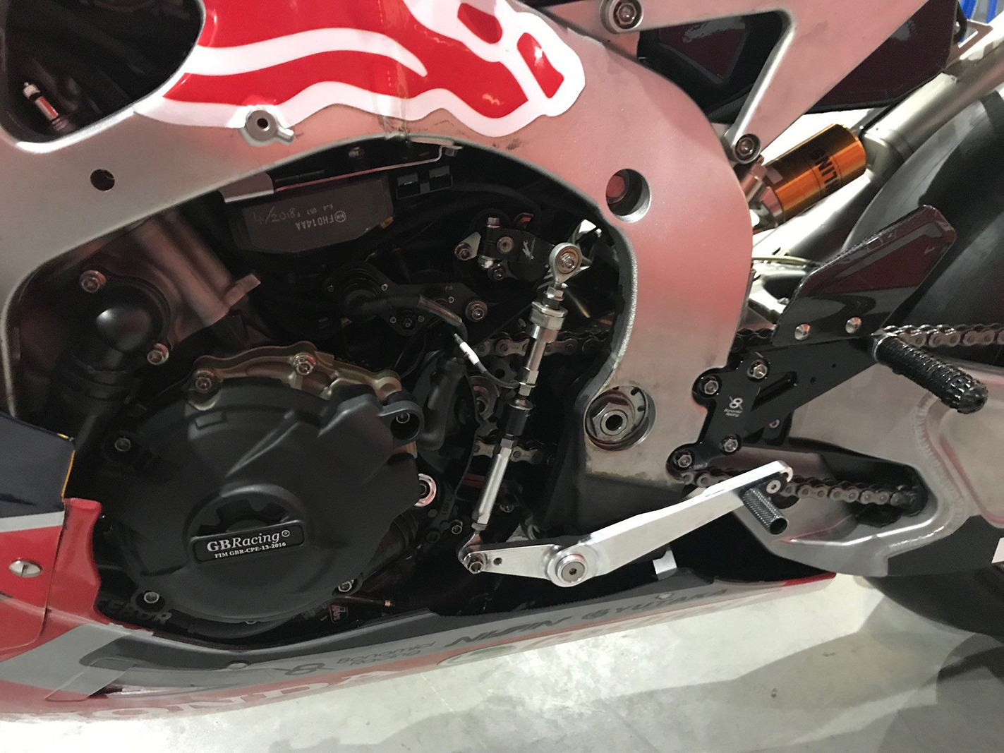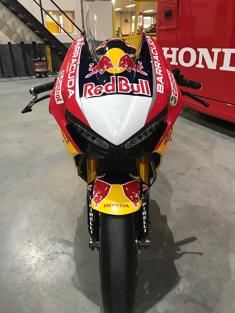 眼前這輛CBR1000RR已經擁有全車Red Bull塗裝,Ten Kate Racing強調這輛以SP2為基底改裝而來的比賽車與2018年該車隊車手Leon Camier與Jake Gagne兩位車手上場拼搏的版本相同,擁有全套的賽車套件。該車安裝了Ten Kate Racing旗下最高階的引擎改裝套件,官網強調這是Racing spec且與改裝大廠Cosworth一同研發,電控則來自MotoGP供應商Magneti Marelli製品,原本便擁有192ps為大馬力的RR SP2將會有更猛爆的輸出。