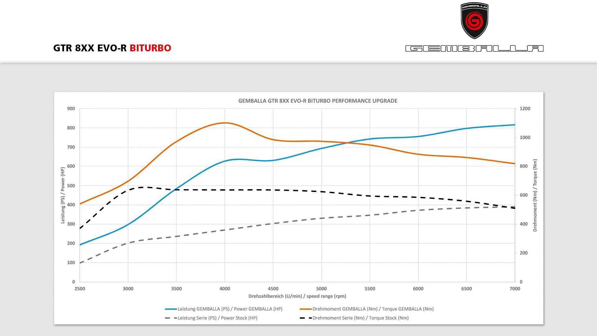 GTR 8XX EvoR BiTurbo可壓榨出807匹馬力與1098牛米的扭力,從靜止加速到100公里/小時只要2.38秒,然後在7.5秒內便可達到200公里/小時,車輛極速達到340公里/小時。許多車迷對於跑車的聲浪很講究,Gemballa大修了911 Turbo的排氣聲,對於聽覺與性能更上一層樓。在車頭有一個訂製的引擎蓋,帶有大型進氣口與分流器前保桿,車側輪弧前面向外延伸30mm、後部增加50mm。與原廠911 Turbo相比,能允許更寬的輪胎規格裝配,至於其他改裝項目也只能從照片上來察覺。
