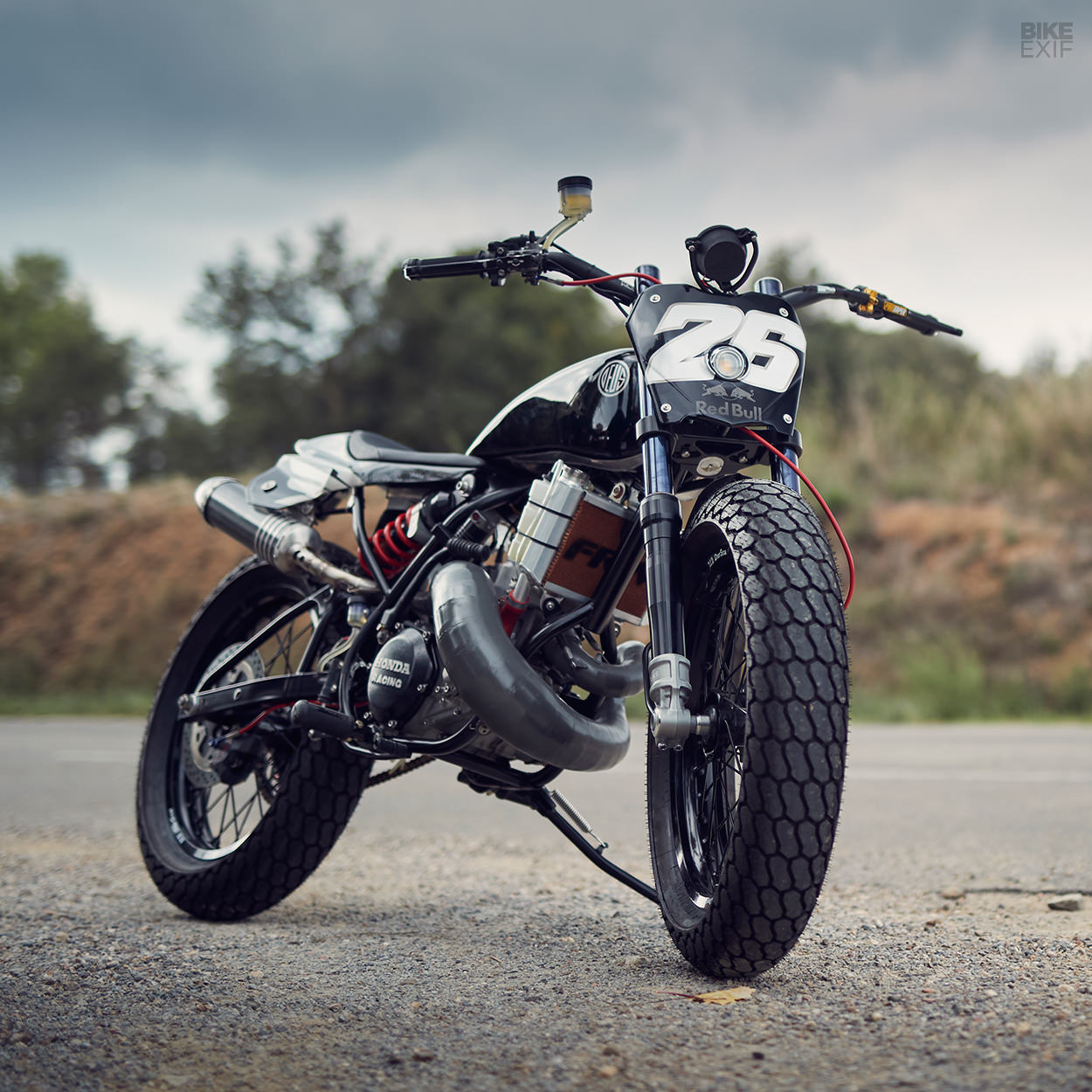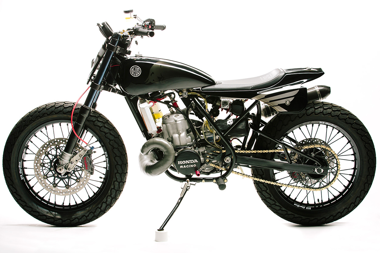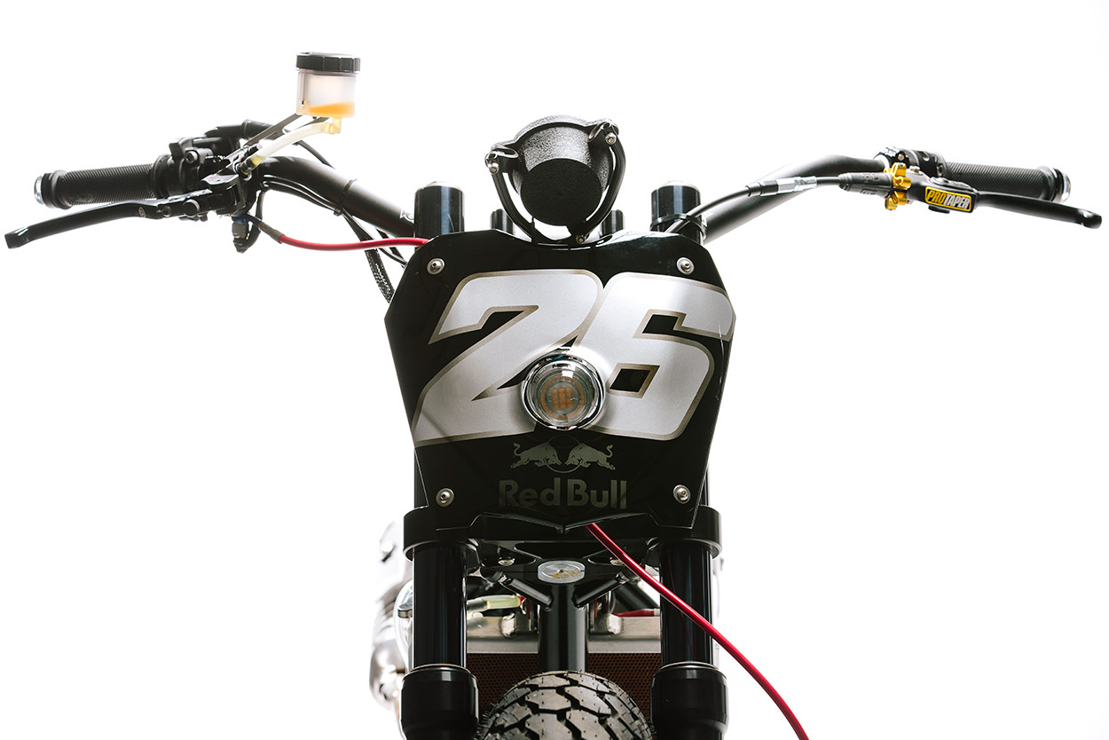 這輛HONDA手工改裝的泥地賽車是Dani的退休贈禮,由來自Deus Ex Machina的設計總監Michael Woolaway與Red Bull共同合作而成的作品。Woolie是DEUS在美國的主力改裝首腦,對於改裝車的動力表現絕不允許有任何低頭妥協,而論及速度,在這世上問蒼天又有誰能與Dani一個月前才跨下的RC213V匹敵?