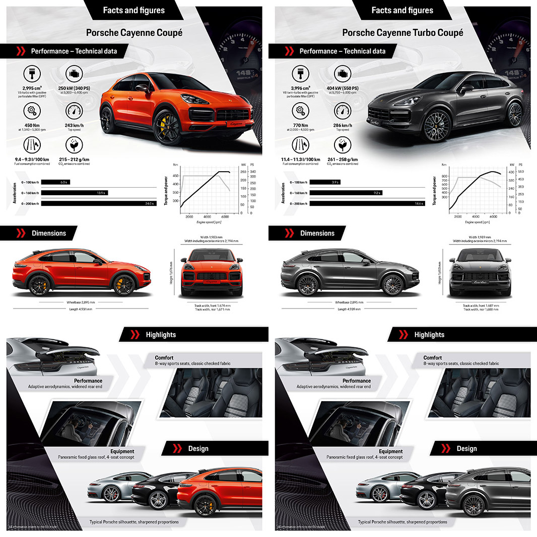 首波推出的車型中,分別為Porsche Cayenne Coupé與Porsche Cayenne Coupé Turbo,分別採用3.0升V6渦輪引擎以及4.0升V8渦輪引擎,最大輸出動力分別為340PS、45.9Kg-m與550PS、78.5kg-m,0-100km/h加速時間Porsche Cayenne Coupé為6秒,但如果選配輕量運動套件則縮短到5.9秒,Porsche Cayenne Coupé Turbo的加速成績則為3.9秒。