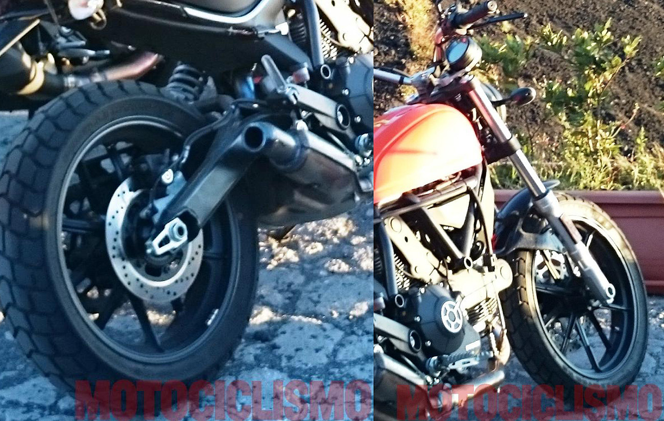 由照片可觀察到SCRAMBLER 400前叉改為正叉,後搖避比起 SCRAMBLER 800更陽春,引擎外觀看似保留L型雙缸的設置,但排氣管走法與800有著明顯不同。不過其他部分看起來與SCRAMBLER 800並無太大差異。