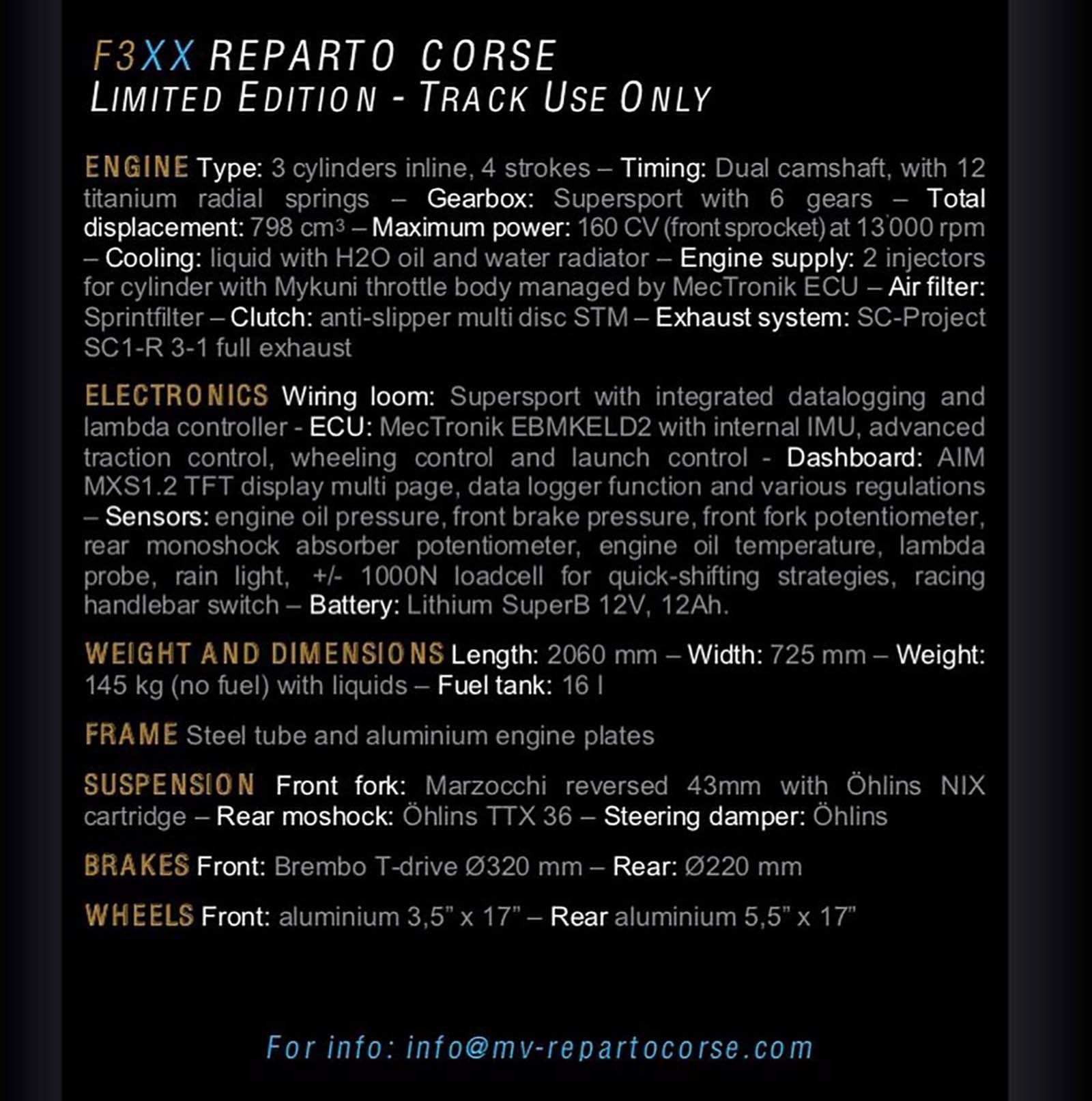 MV Agusta F3XX由MV Agusta Reparto Corse車隊負責販售事宜,其實該車隊與MV Agusta處於獨立作業的個體,在經營上與MV Agusta的市售車部門毫無關聯,這或許也是會有如此瘋狂車款推出的原因之一。