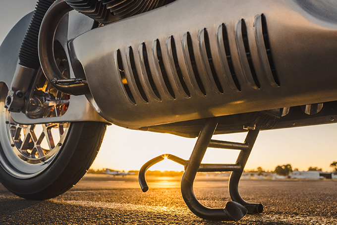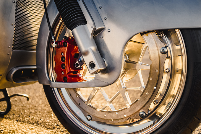 在性能上並沒有太大的改變,畢竟這輛車走的是一種視覺風格,整個車體都採用了金屬包圍,車體的每一個弧面都是透過手工敲打而成,並且用上了飛機鉚接的方法進行,在引擎的下方也開了魚鰓式散熱孔,就連排氣管也都包覆在車體當中,打擋桿與煞車桿的內側也有金屬包覆,僅有開洞讓連桿穿過,前輪也包覆了近一半的面積,並且換上了特製的卡鉗,油箱也經過特別改造,與車身連成一氣,而座椅就像畫龍點睛一般,在這銀白色的車身上有了不同的顏色。