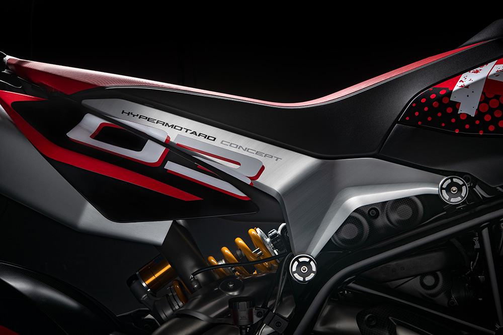 操刀改裝的單位是Ducati公司內部的設計工作室Centro Stile Ducati,950 Concept的設計理念圍繞在「街頭、賽場」的融合,特別是油箱上頭的塗鴉風格HYPER字樣與紅色的幾何造型,呈現出活潑好動的氛圍,呼應Hypermotard 950這類車型濃厚的玩樂特質。