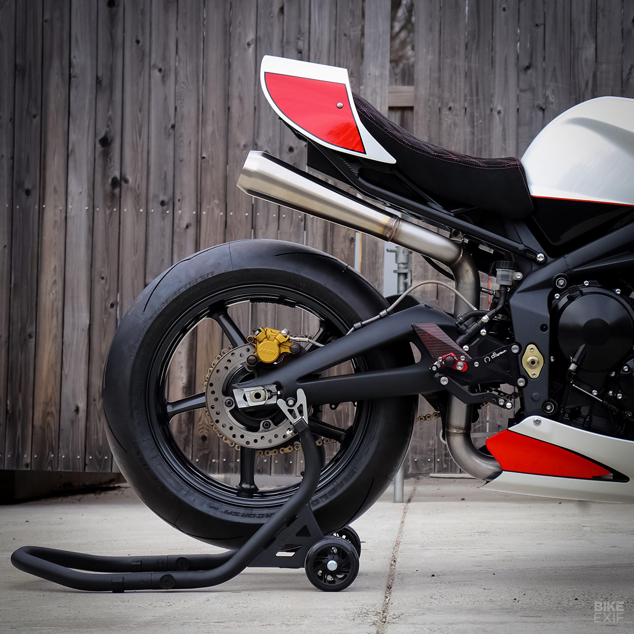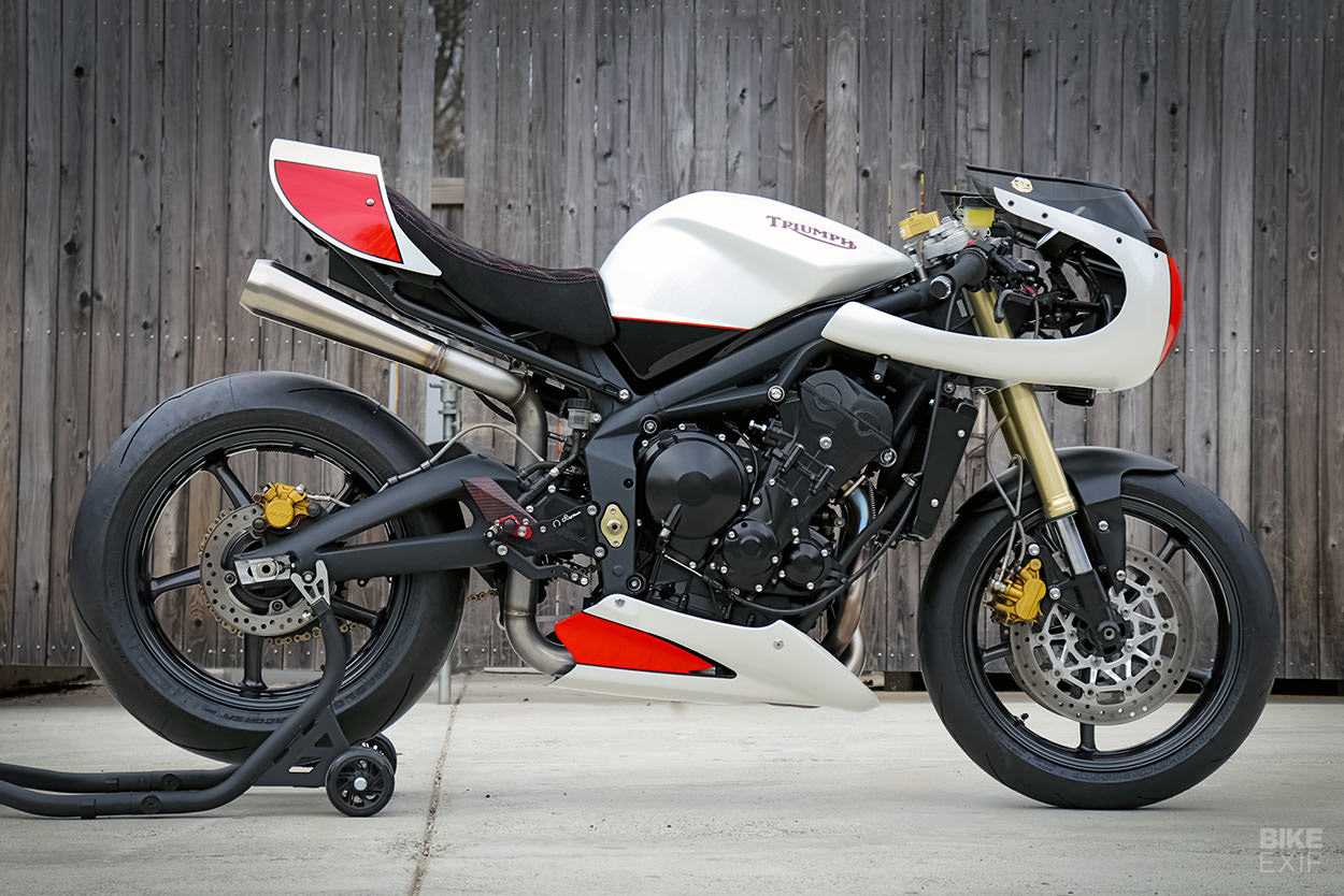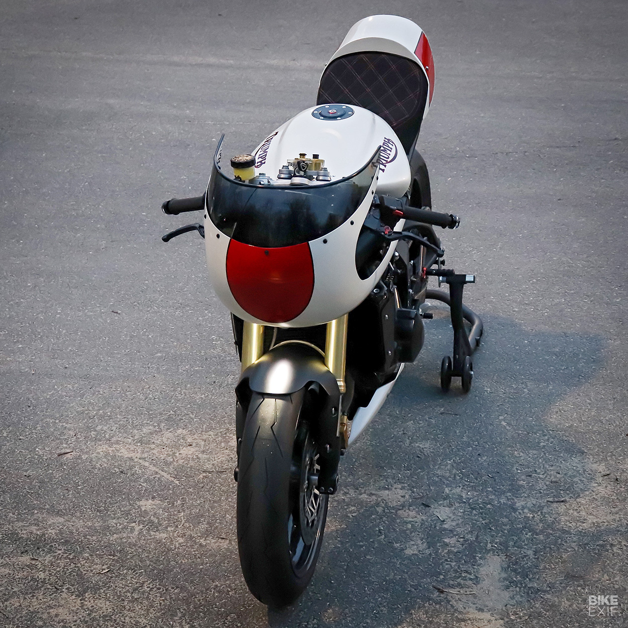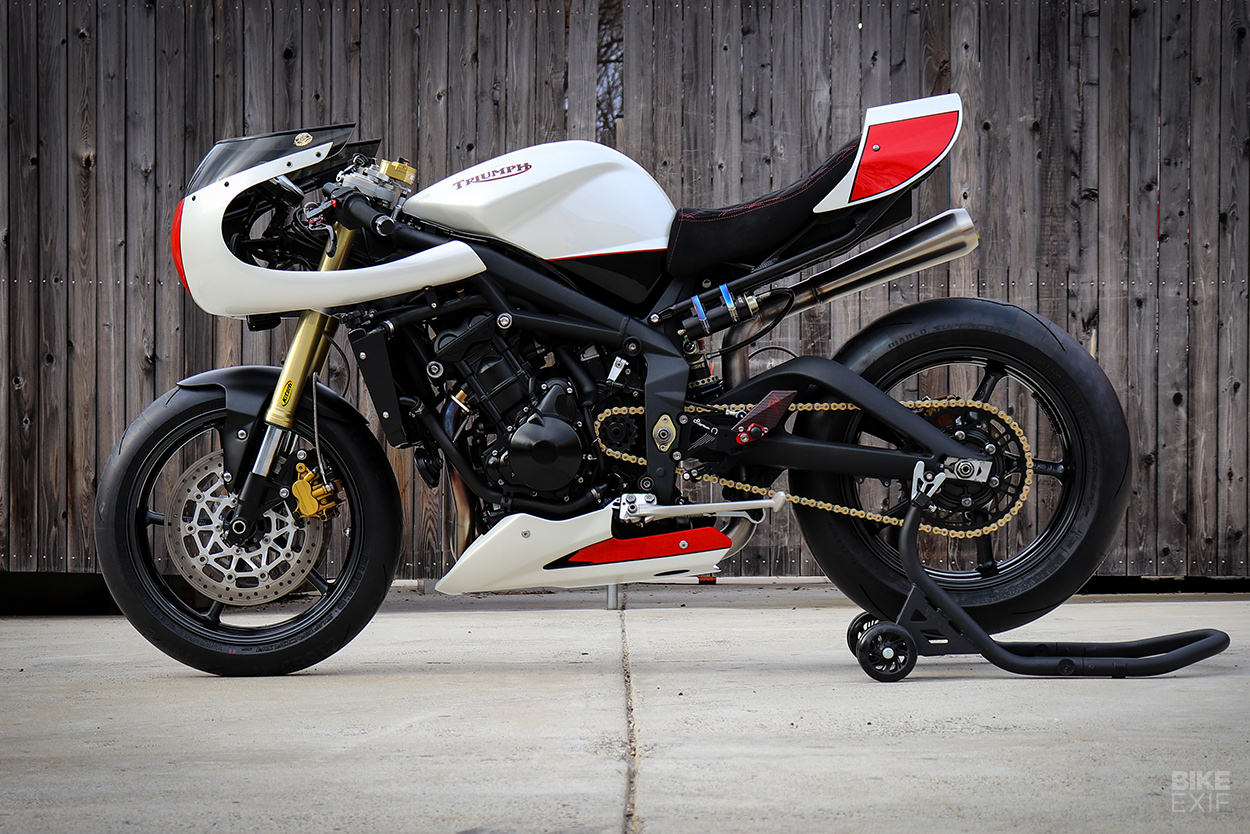 雖然不是人人都喜歡圓滑,簡單的老式賽車風格,但不得不說,這類型的風格不管在什麼時間點,總會有著為數不少的死忠擁護者,除了以原本就具有老味的圓燈街車加以改造以外,使用體質優異的運動仿賽、街車進行大變身,我想是更能呼應老「賽車」運動本質的改裝手法,眼前這輛紅白相間的半罩車款就是以運動表現無庸置疑的Triumph STREET TRIPLE 675改裝而來。