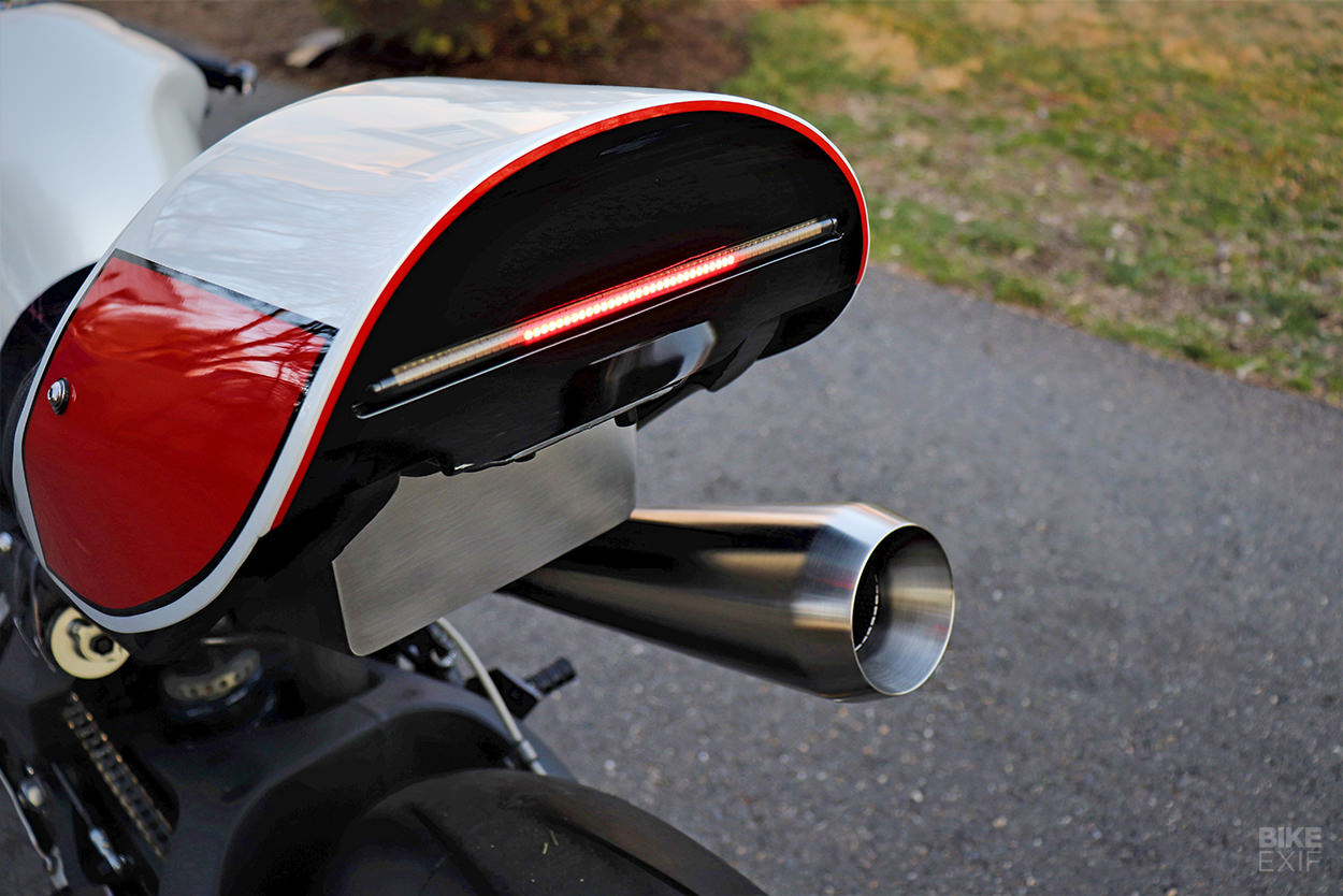 在外觀上,全新的外觀部件皆以玻璃纖維打造,車頭擁有老是賽車那圓滾滾的頭罩,微小的LED車頭燈被隱藏到整流罩下緣,整流罩不同於大多數的Cafe Racer車款採用全包覆設計,半罩呈現的質感更能彰顯機械質感,車底的整流罩與上翹的車尾線條,加上那顯眼的SC Project排氣管,從低角度看去,肅殺氣息油然而生。