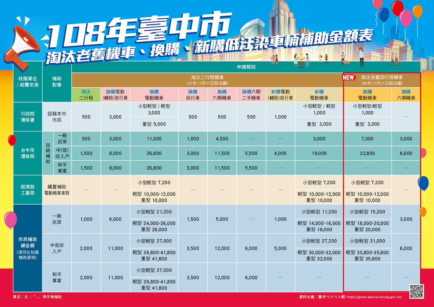 除了上述全國統一的補助方案以外,台中市政府也額外加碼5,000元購車金給換購六期機車的民眾,此外光陽工業也依照車款不同,再針對台中市加碼5,200元購車金。綜合以上中央政府、台中市府,以及光陽工業加碼補助下,台中市民最高可領到19,000元的補助金,用划算的價格購買新車。