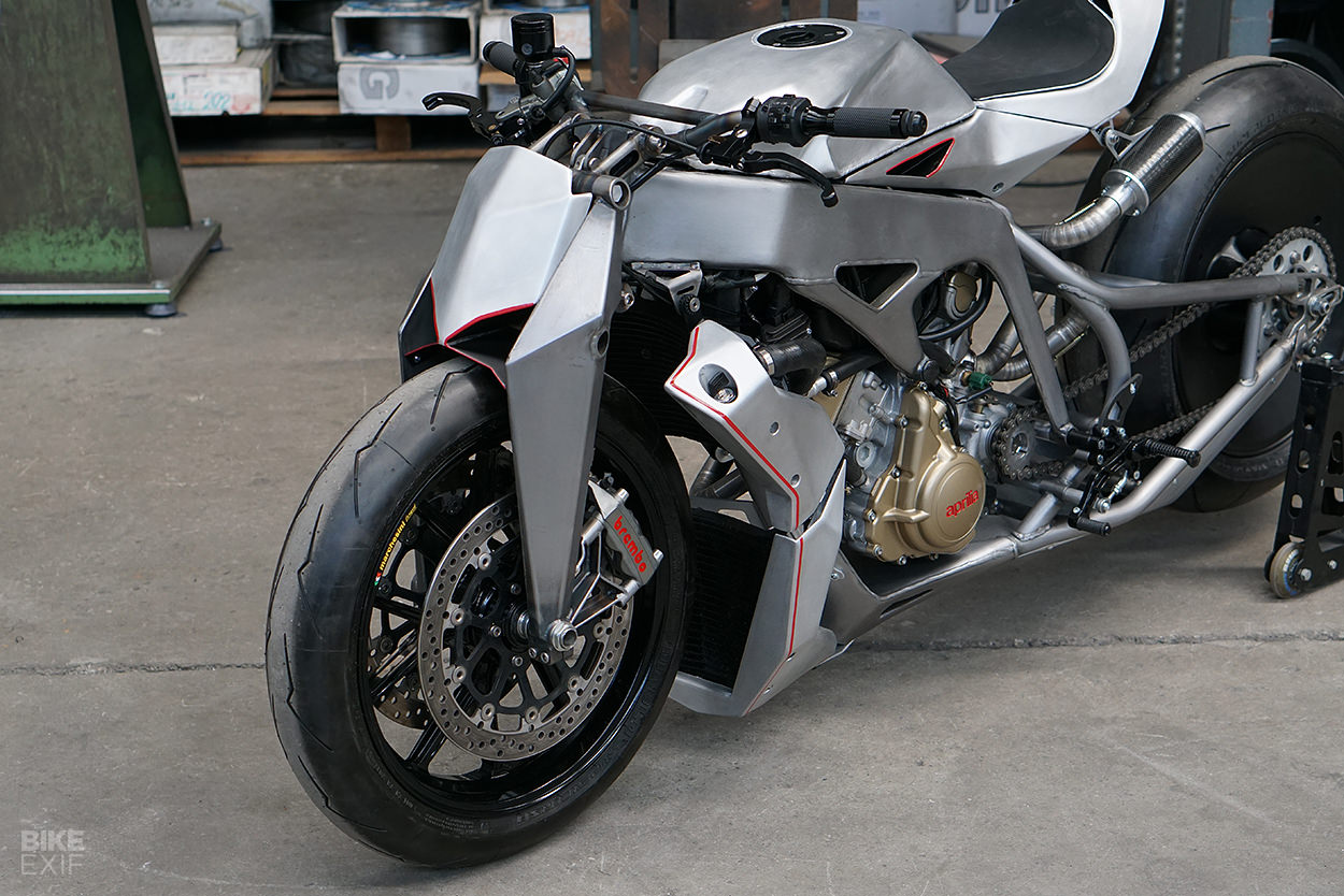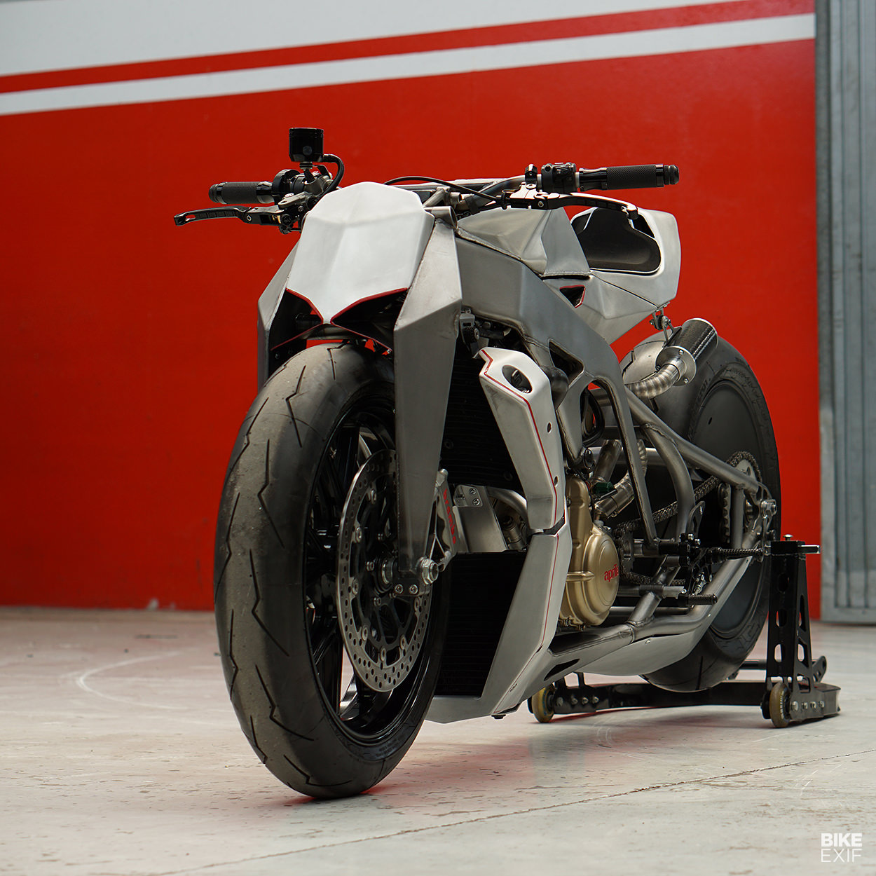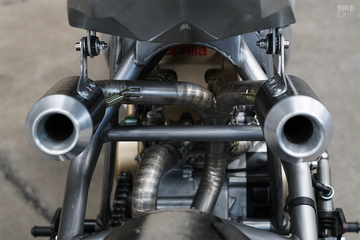 SXV550引擎是一塊璞玉,Simone創造了一個定制的不銹鋼材質的排氣系統,它就像蛇一樣盤繞在整部作品裡,在椅墊下有兩個碳纖維消音器。每一毫米都是手工精心製作。新車架需要一個新的冷卻系統,因此Simone修改了一對Ducati Streetfighter散熱器,並將它們塞進了前輪後面的車身下方。