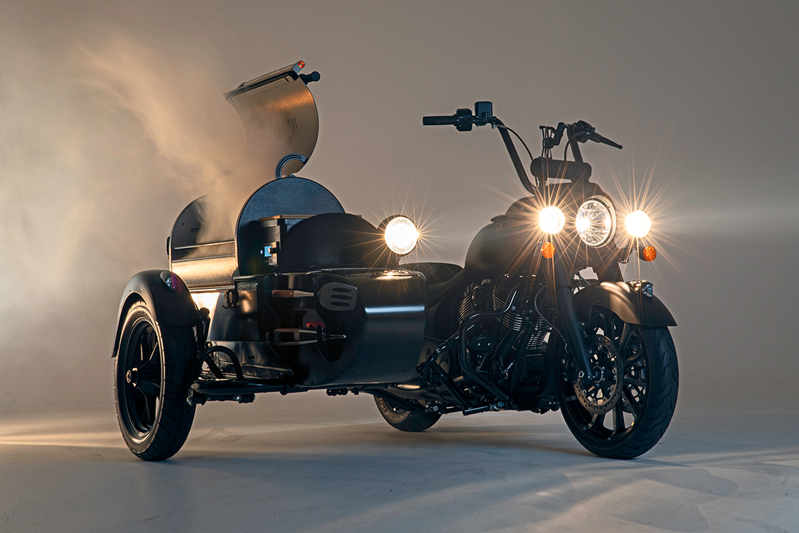 這項作品以Indian著名的酋長系列Chief Dark Horse做為基底進行改裝,而邊車則是對應Chief Dark Horse的復古風格進行車型與塗裝上的搭配,在邊車的外觀上採用老式的船型邊車造型,並將邊車與Traeger Ironwood 885燃木烤肉架完美結合,整體重量為70公斤,對於逼近2000c.c的Chief Dark Horse來說完全不是問題。