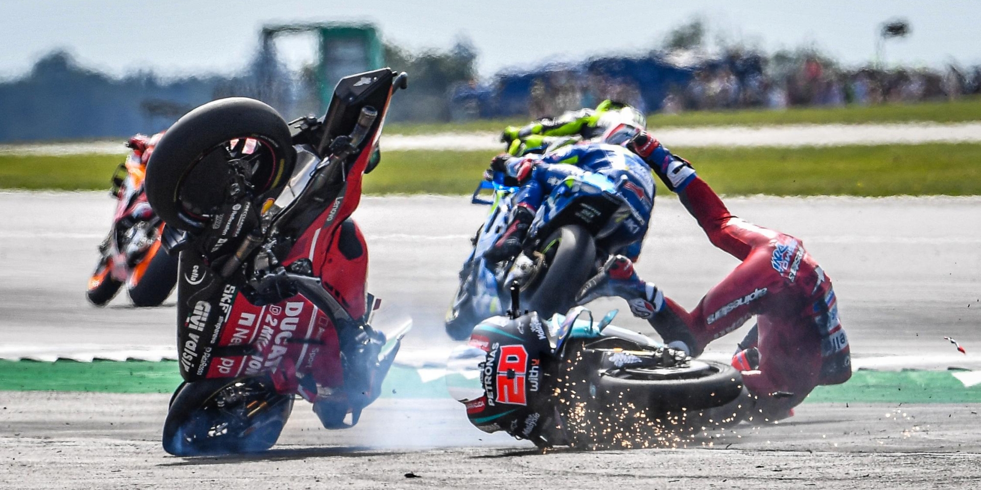 在Silverstone賽道上,讓Marc Marquez謹慎堤防的並非分站冠軍Alex Rins,而是法國新秀Fabio Quartararo。而Quartararo也樂於接受這些挑戰,以第二排起跑之姿準備在英國一展身手。但這一股熱情只延續了六秒,在進入第一彎時遭到超車的Alex Rins車體晃動影響,Quartararo本能性的做出反應,但車輛處於極大傾角時,多帶一點剎車都是致命,也因此,倒楣的M1一個High-side順便帶走後方更倒楣的DUCATI GP19,Dovizioso直接摔了一個倒頭栽,戰局情勢瞬間豬羊變色。