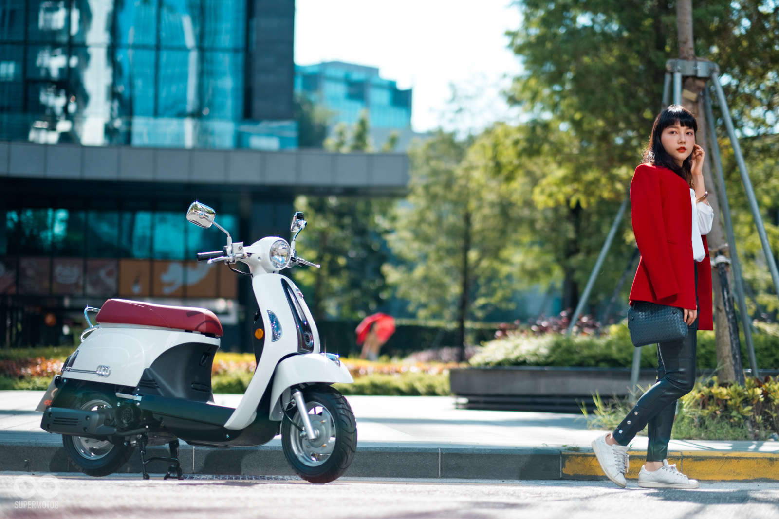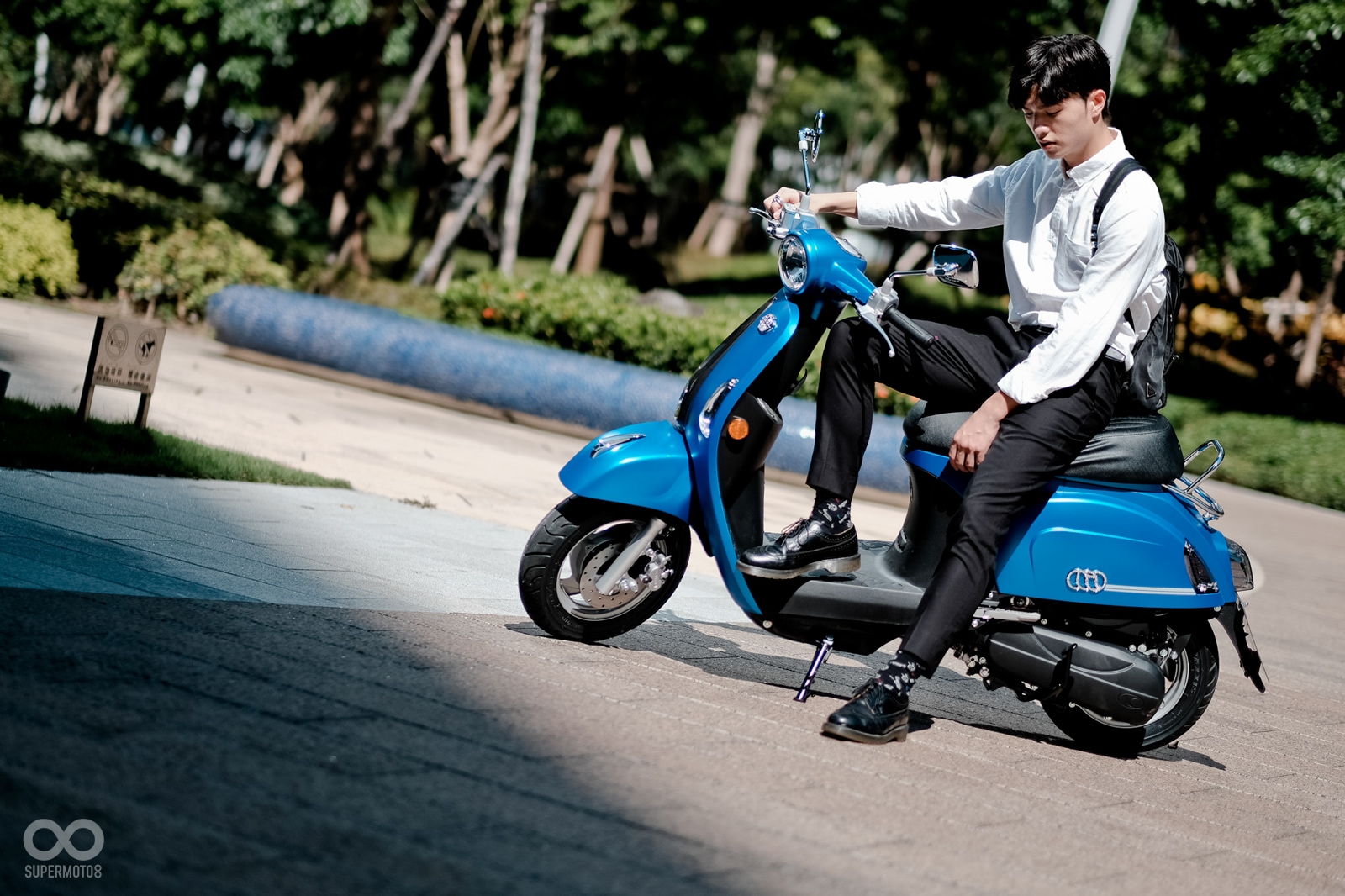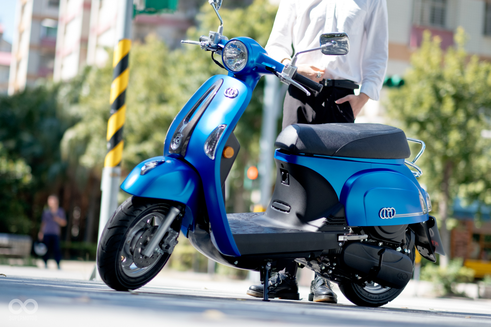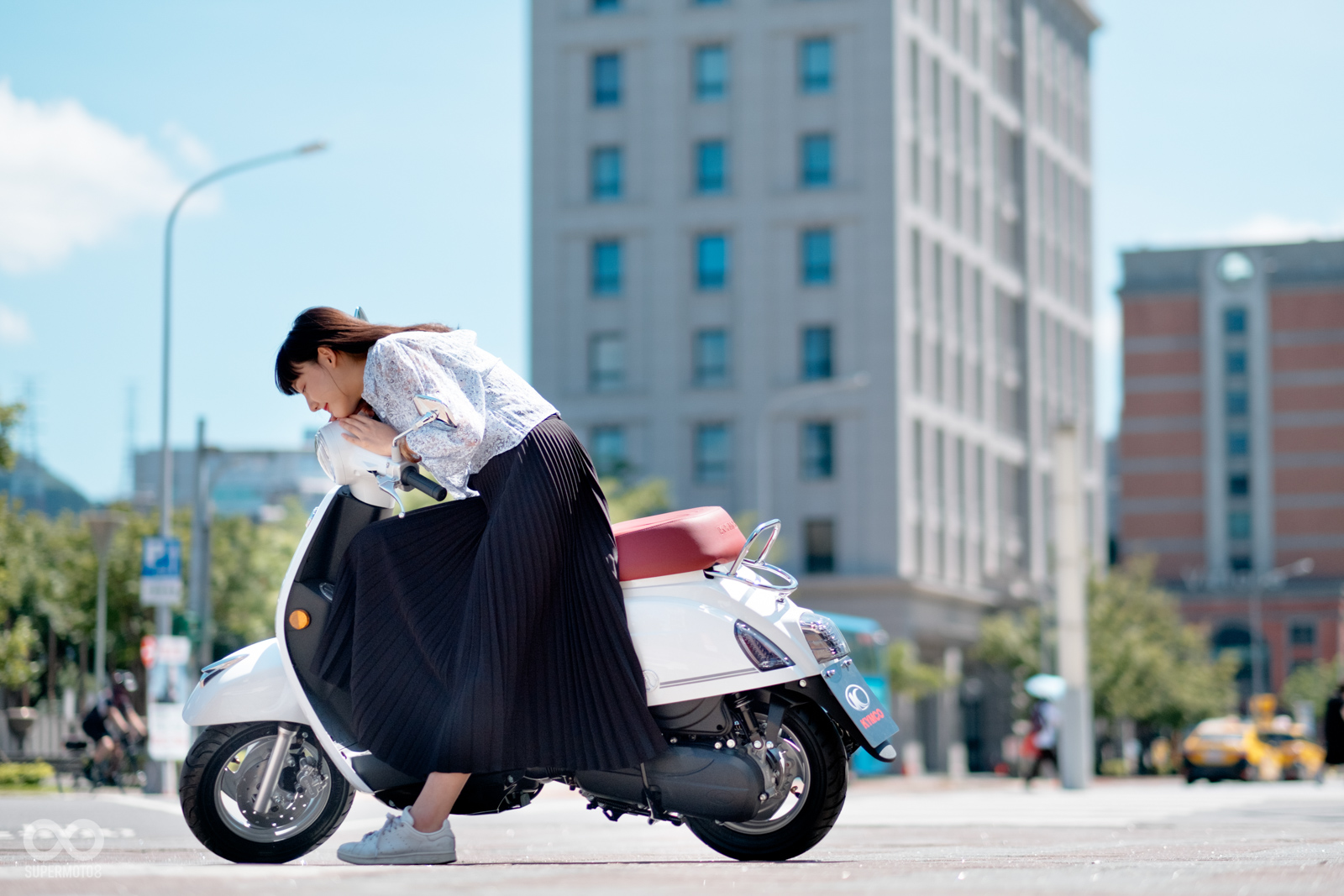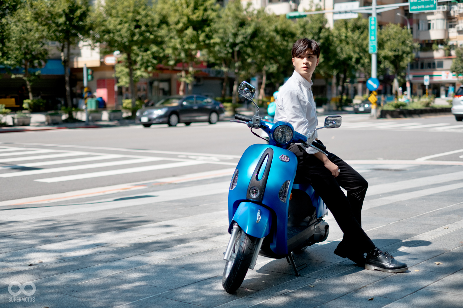 恰好拍攝當天台北天氣相當強朗,在太陽光的照射以及模特兒的襯托下,的確很難不注意到的水鑽在車輛前方、車側的存在感,而我也必須老實說雖然之前在路上總是時不時會看到MANY110施華特仕版,但從沒仔細看過這些水鑽的質感,經過拍攝工作後才實際暸解到這些水鑽的效果遠比想像中強烈,比起加個貼紙的效果,實體的水鑽的確明顯、有感不少。