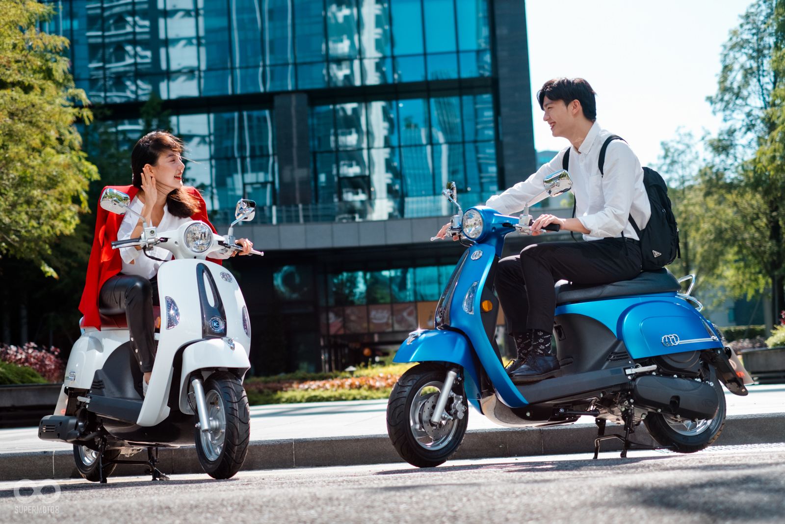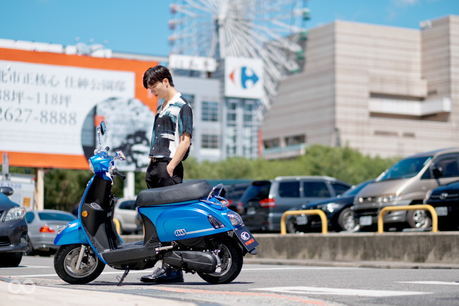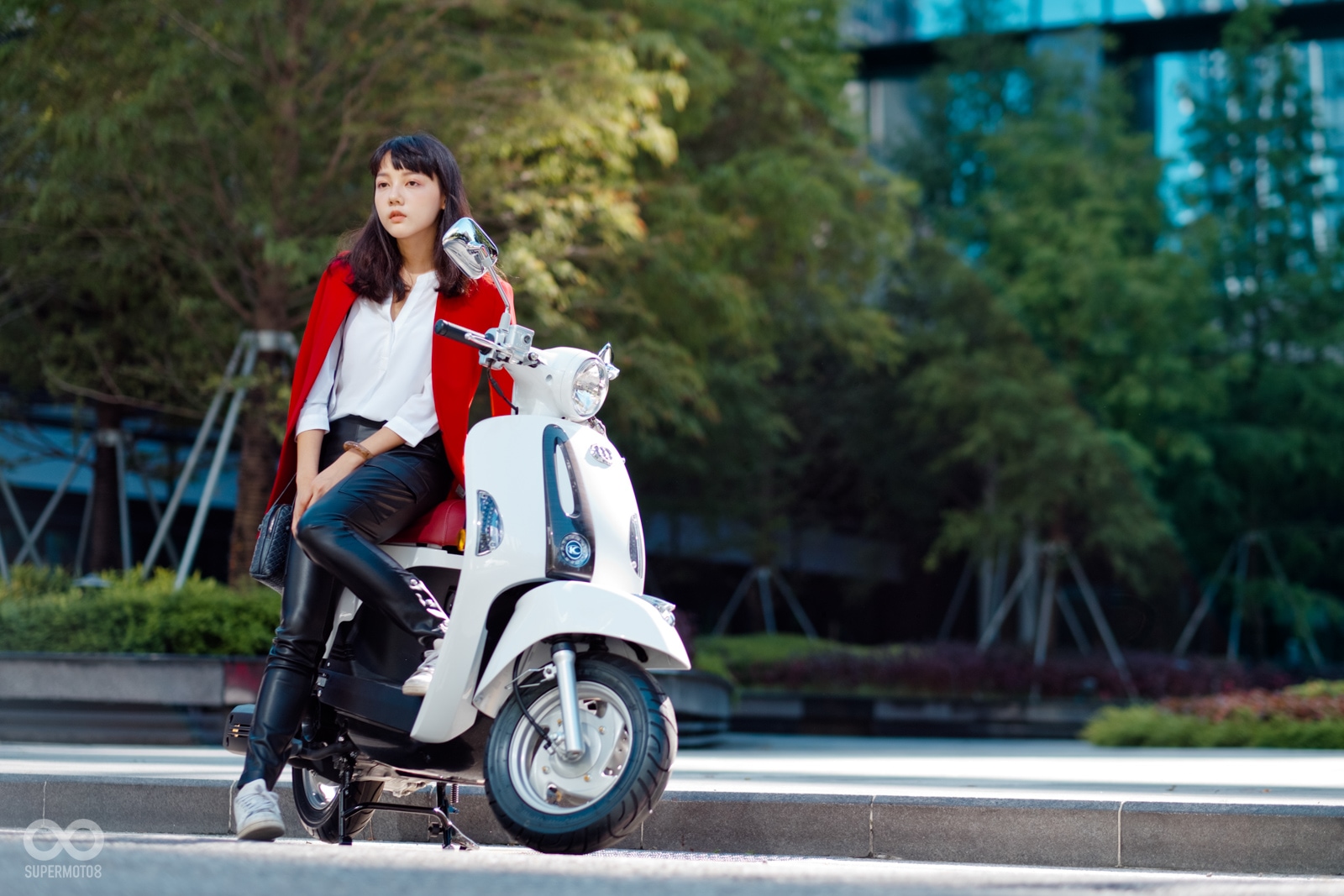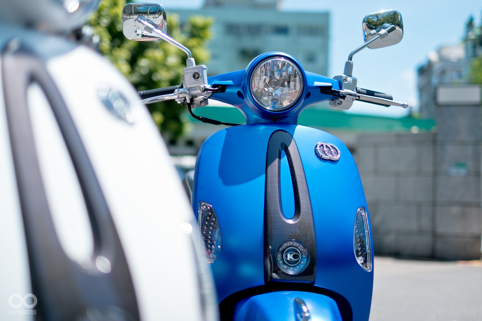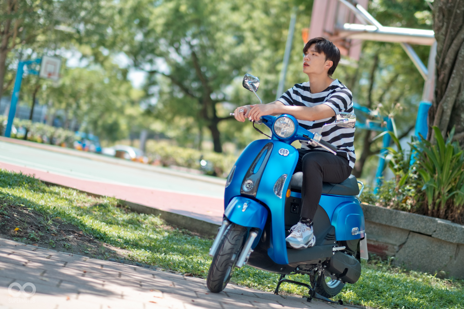 恰好拍攝當天台北天氣相當強朗,在太陽光的照射以及模特兒的襯托下,的確很難不注意到的水鑽在車輛前方、車側的存在感,而我也必須老實說雖然之前在路上總是時不時會看到MANY110施華特仕版,但從沒仔細看過這些水鑽的質感,經過拍攝工作後才實際暸解到這些水鑽的效果遠比想像中強烈,比起加個貼紙的效果,實體的水鑽的確明顯、有感不少。