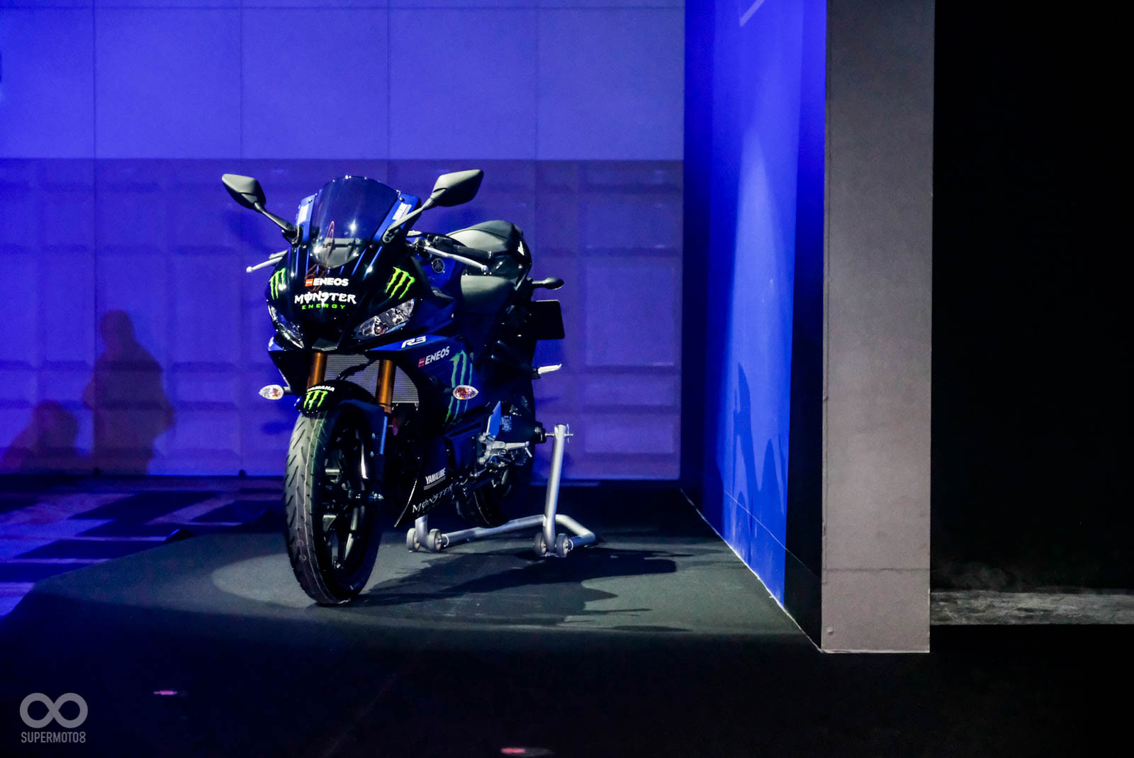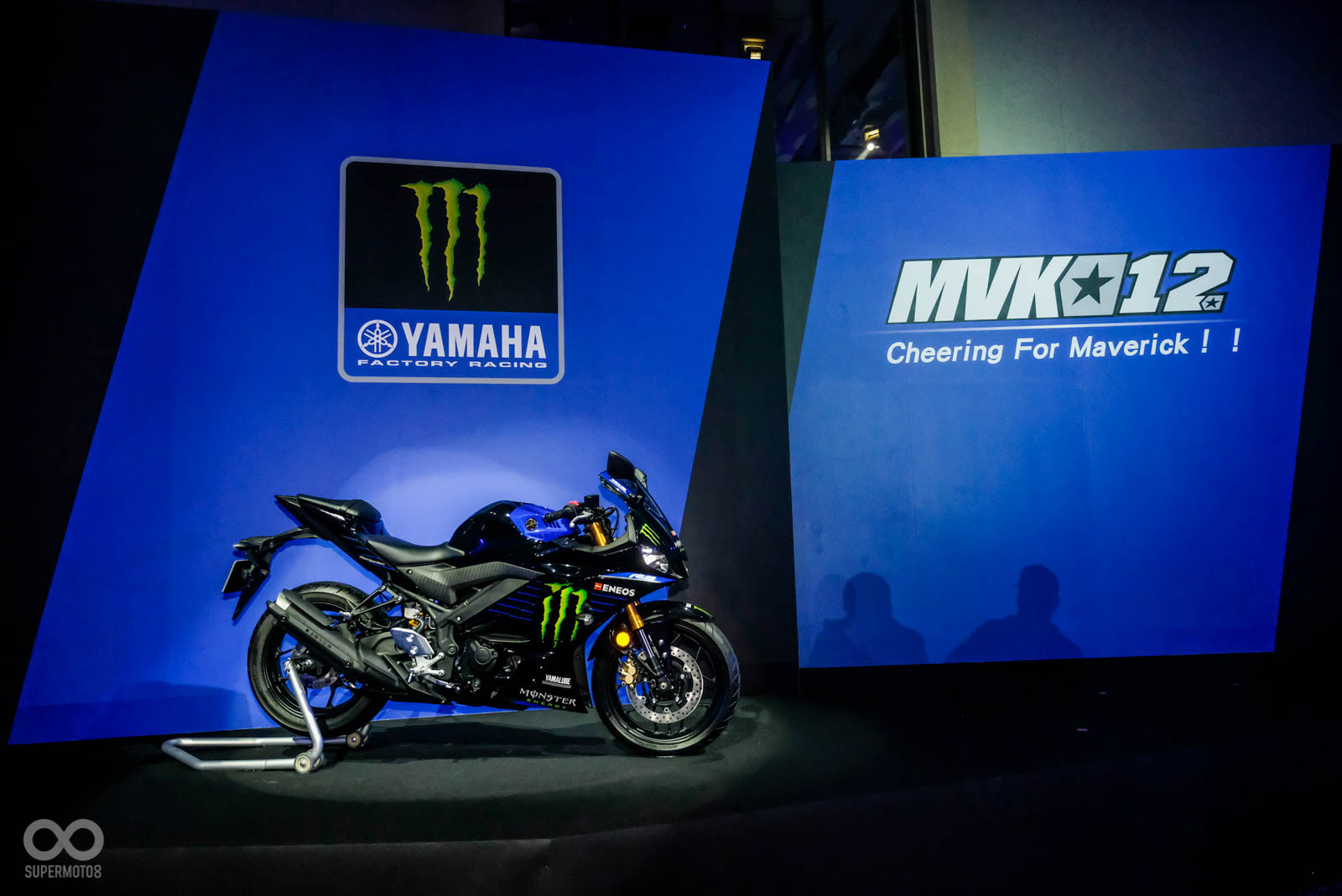 在活動現場的舞台上頭官方擺放了一輛YZF-R3 Monster Energy Yamaha MotoGP Edition,這也是台灣山葉2019年底引進的重點車款,顧名思義該車款與MotoGP場上的M1看齊,擁有主贊助商Monster能量飲料的斗大logo,並且換上了藍、黑廠車塗裝。