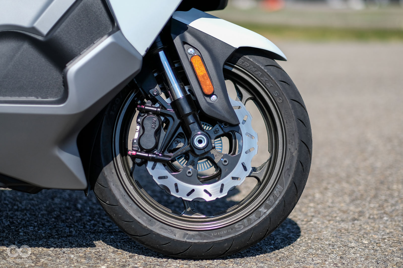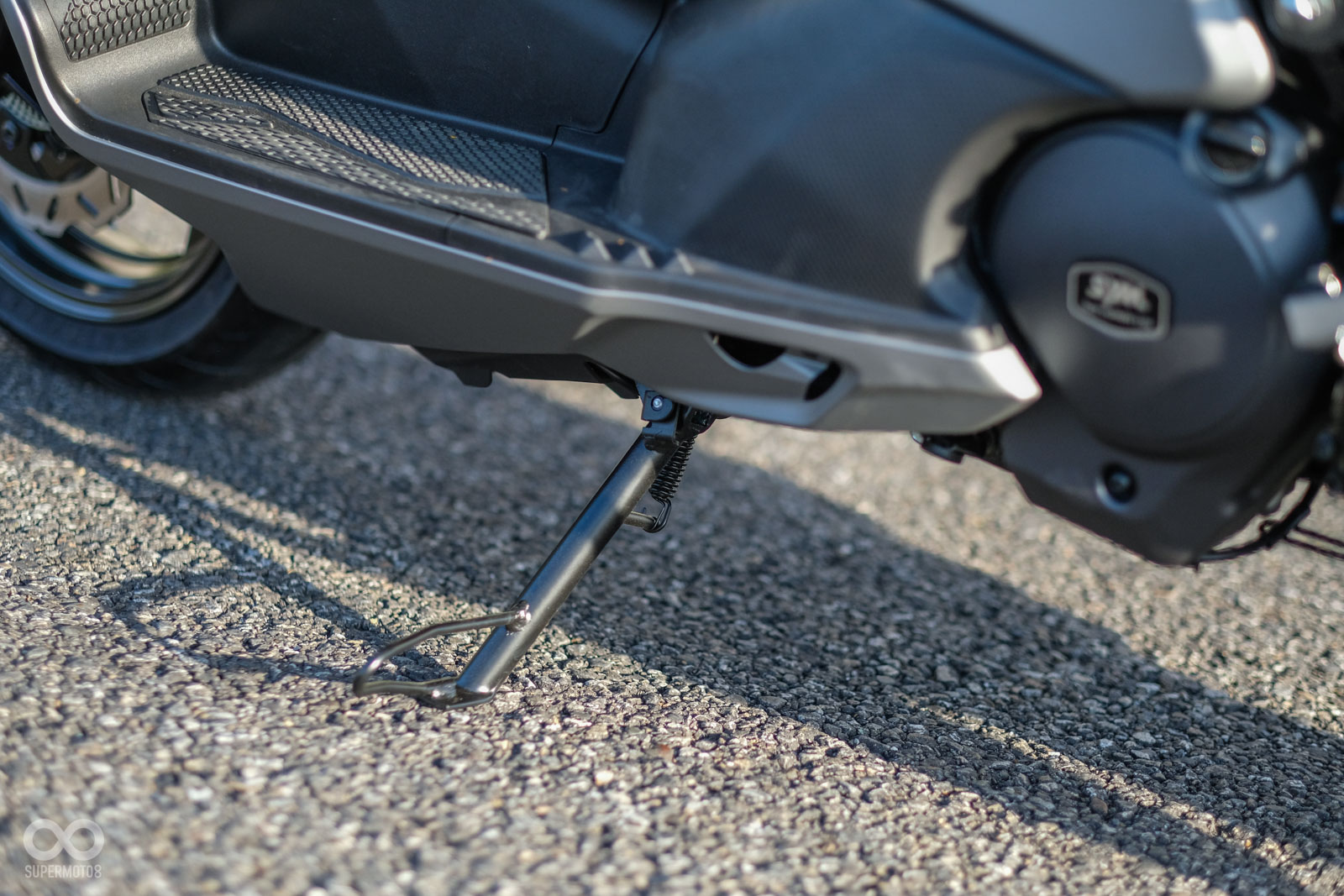 前後碟盤規格皆為275mm,前煞車配有輻射對四卡鉗,後煞車使用單活塞卡鉗並配有手煞車,且SYM工程師貼心的將手煞車與側柱整合,踢下側柱馬上拉起手煞車,是相當貼心的設計。