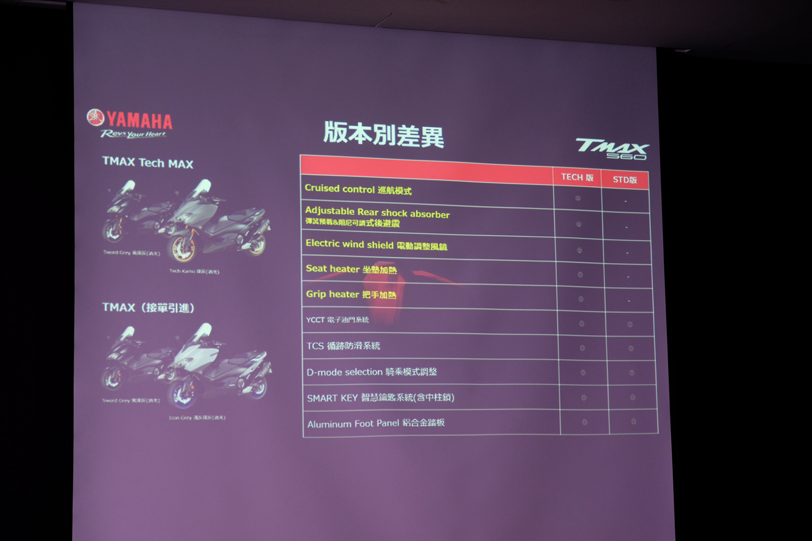 這次台灣山葉也引進兩個等級的TMAX 560車型,分別為標準版的TMAX 560,以及豪華版的Tech MAX,兩個版本之間的差異在於Tech MAX版增加了電動風鏡、巡航系統、、加熱手把、MyTMAX科技互聯以及多款高階配備。