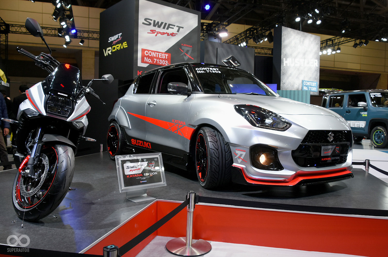 於2020東京改裝車展曝光的SWIFT SPORT Katana Edition與先前限量的芬蘭版本不同,前後保險桿以及葉子板都經過明顯加寬,呈現出截然不同的戰鬥氣息。配色與彩繪承襲KATANA上頭的銀、黑、紅三色點綴,比起荷蘭版本有更明顯的「刀」味。