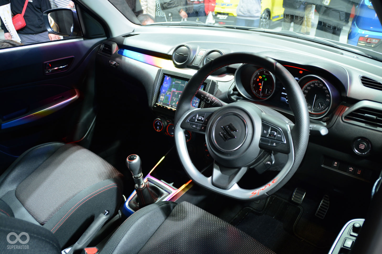 內裝同樣經過大幅修正,首先飾板加入大量的彩鈦烤漆,讓車艙顯的戰鬥感十足,副駕駛座有著特仕車的專屬銘牌,方向盤也採用雙色搭配,讓車內氣氛與一般車型有著明顯差異,活動會場SUZUKI也將四輪、二輪同步展示,明顯鎖定熱血「刀」迷目光!