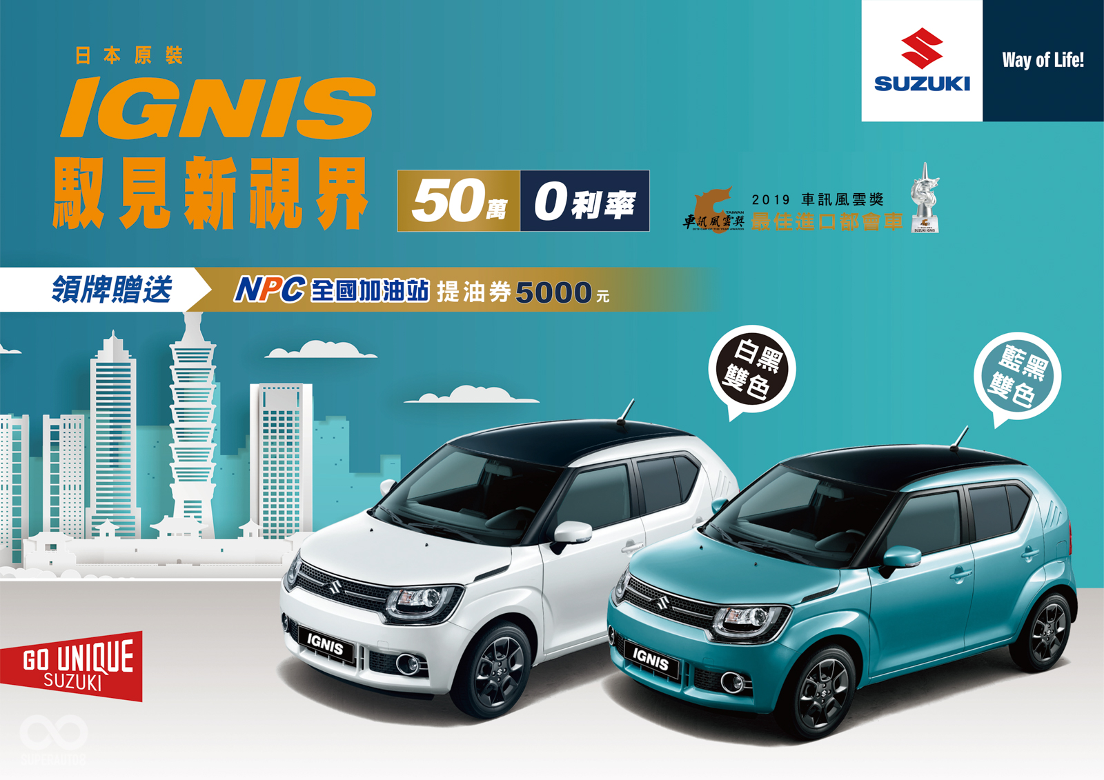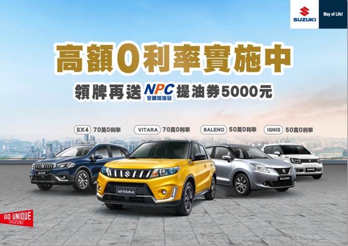 為了感謝台灣車主2019年的支持愛護,並且讓更多消費者享受SUZUKI獨特的駕馭體驗及優質服務,TAIWAN SUZUKI本月特別推出「雙喜臨門」方案,即日起至2月底,精選四款銷售車種:含SX4、VITARA、BALENO和IGNIS,購車享高額0利率,領牌再送5,000元加油金的雙重優惠,輕鬆入主SUZUKI新車正是時候。同時,TAIWAN SUZUKI也為全台的頭家加油!本月入主ALL-NEW CARRY,領牌即享5,000元加油金,打拼事業更加游刃有餘。限時優惠錯過不再,快到最近的經銷商試乘賞車。