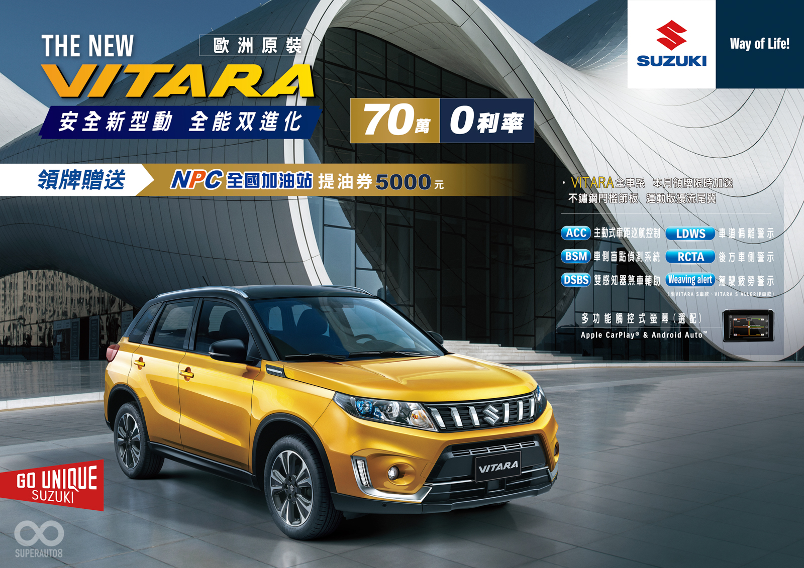 VITARA GLX售價:780,000/ (配備多功能觸控式螢幕)售價:782,000/ VITARA S售價: 870,000/VITARA S ALLGRIP 920,000(單色) 930,000(雙色)