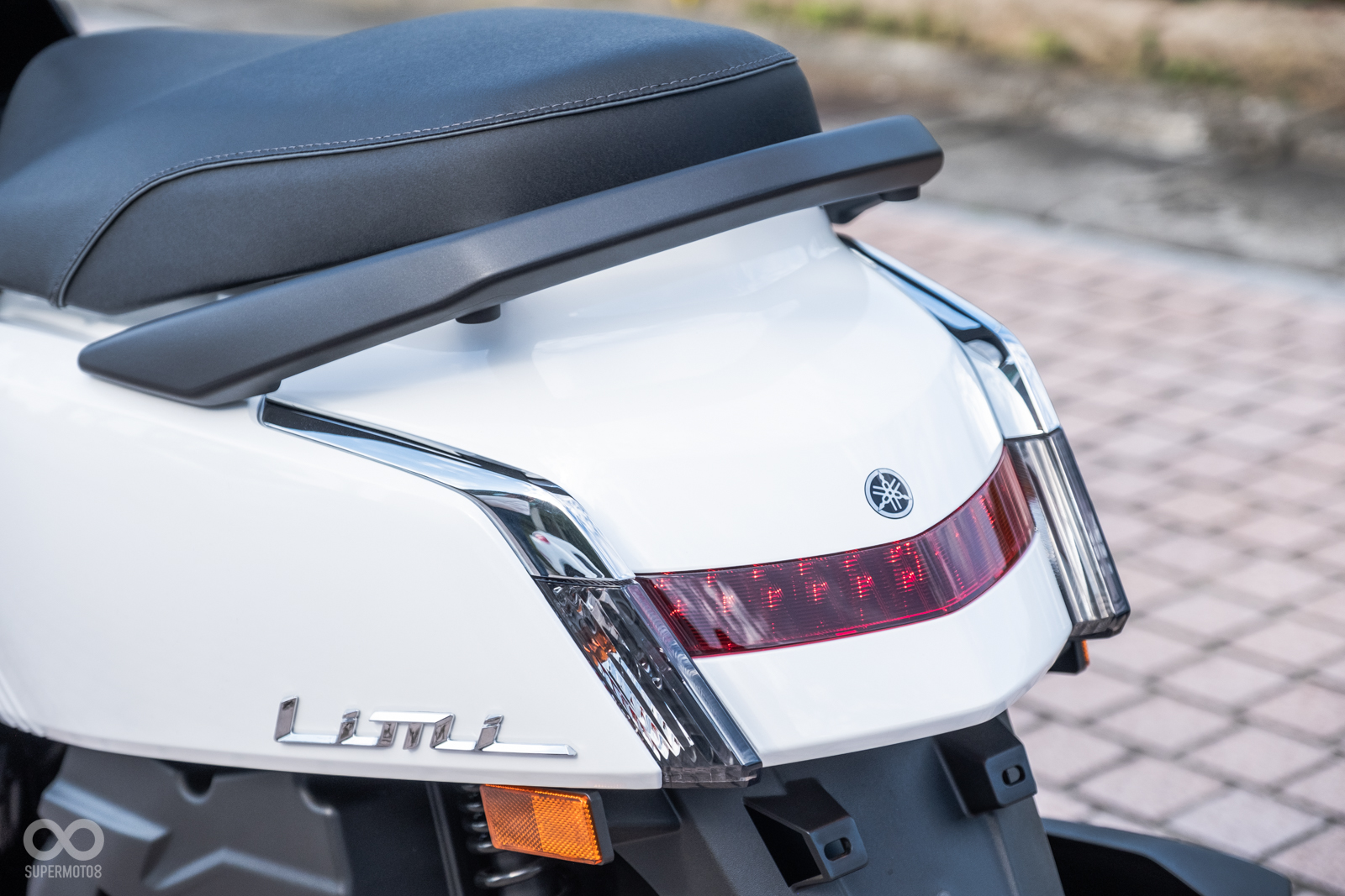 將目光帶向車輛後方,獨樹一格的造型依舊可以在坐墊下車殼發現。承襲前述較為肌肉感設計,坐墊下更加上三條有如動物侵略過後留下的抓痕,車尾燈組也維持H型設計,但較為可惜的是前、後方向燈依舊為鹵素燈泡。