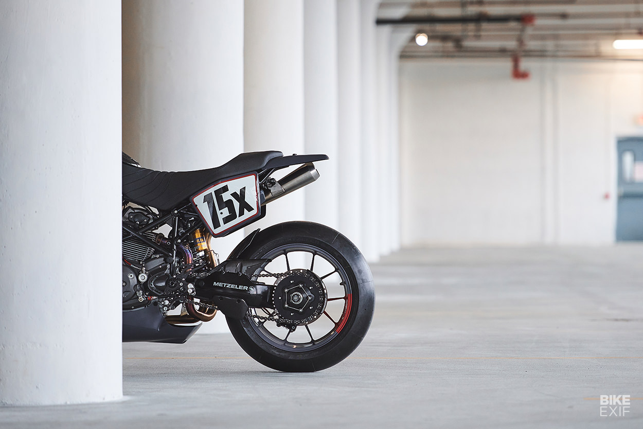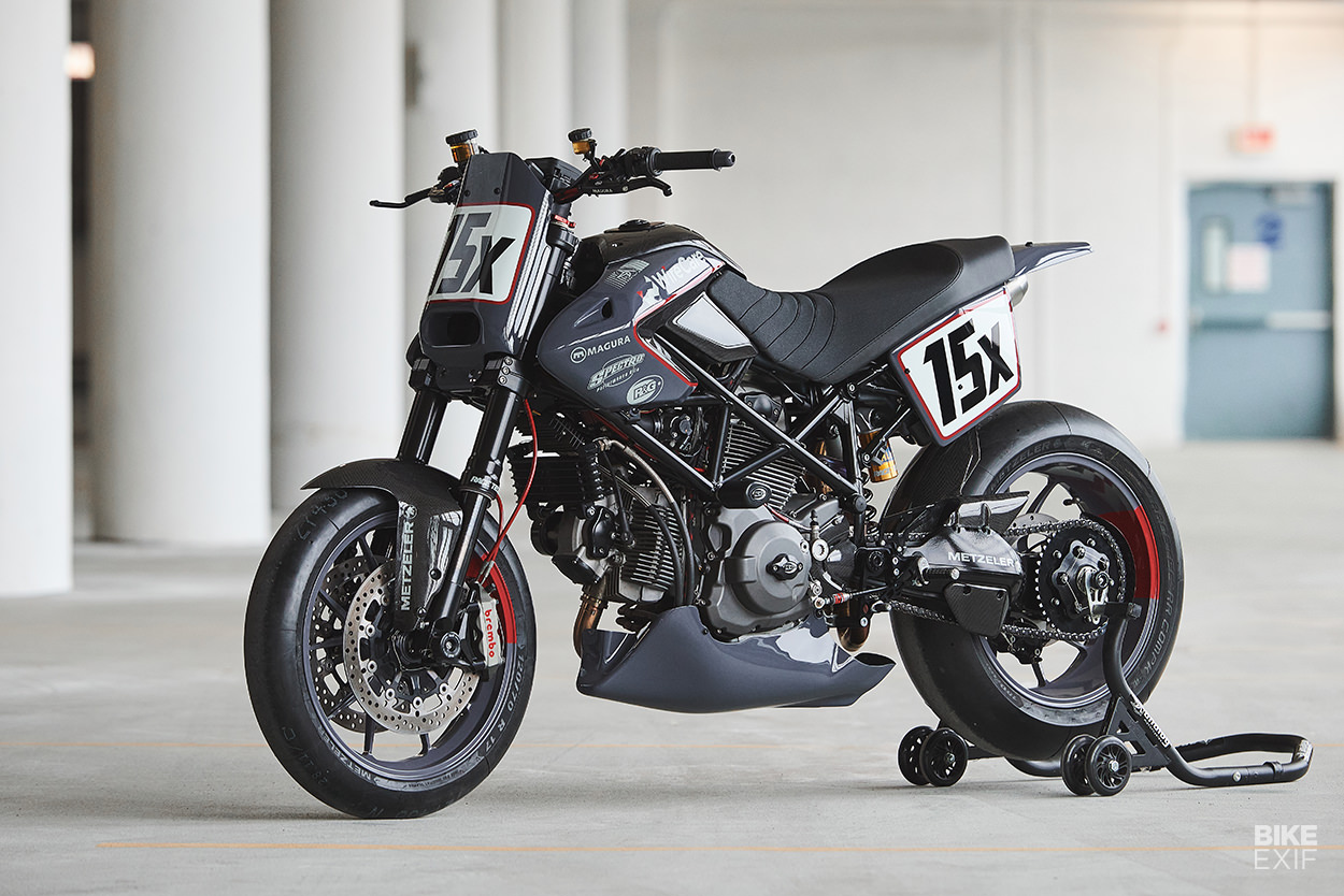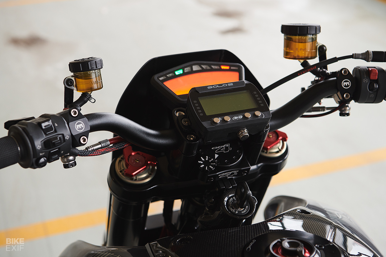 賽事用車的基本就是輕量化,因此Tony竭盡全力來減少Hypermotard身上的重量,Tony換地了油箱罩、並且全部換成更輕巧的碳纖維零件,並且安裝在訂製的支架上。後擋泥板、側板以及儀表周遭的造型之家全部都是訂製,即便三言兩語帶過,但其中與原廠Hypermotard差距甚大,也許Tony並沒有鉅細靡遺地將所有的心血都一一列出,仔細看這輛拿來比賽且Race Ready的Hypermotard,其實也已經像個藝術品般精緻且討喜。