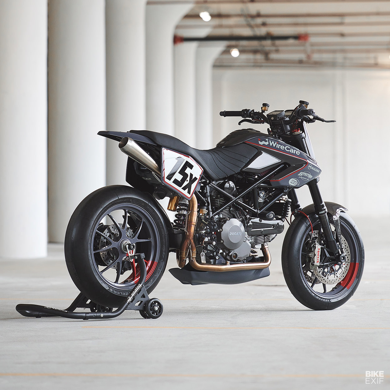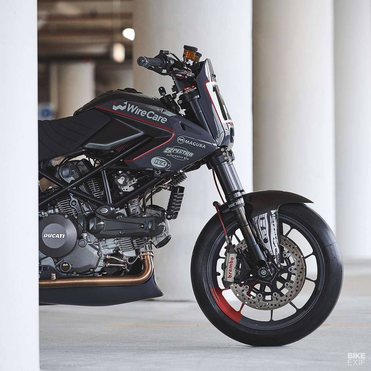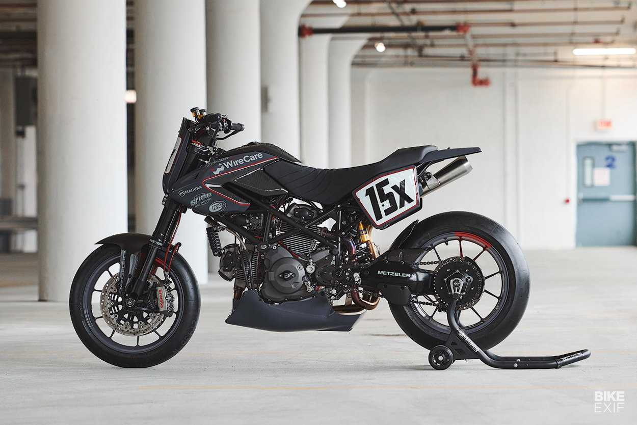 賽事用車的基本就是輕量化,因此Tony竭盡全力來減少Hypermotard身上的重量,Tony換地了油箱罩、並且全部換成更輕巧的碳纖維零件,並且安裝在訂製的支架上。後擋泥板、側板以及儀表周遭的造型之家全部都是訂製,即便三言兩語帶過,但其中與原廠Hypermotard差距甚大,也許Tony並沒有鉅細靡遺地將所有的心血都一一列出,仔細看這輛拿來比賽且Race Ready的Hypermotard,其實也已經像個藝術品般精緻且討喜。