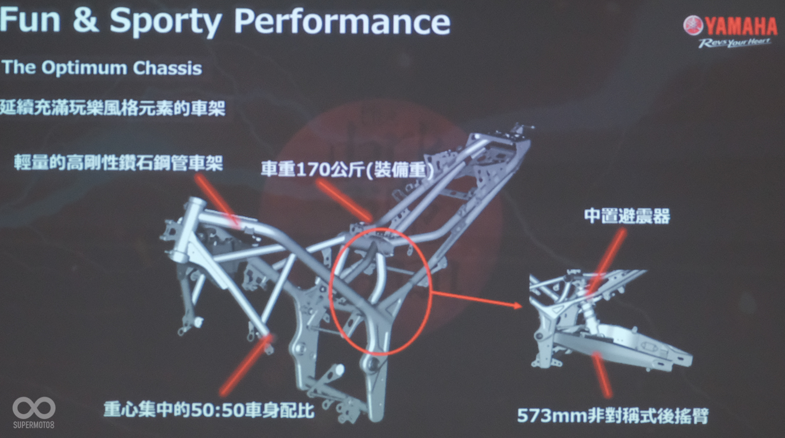 車架部分,也同樣是使用與上一代相同的輕量高剛性鑽石鋼管車架設計,換上新的37mm倒立式前叉之後,相信會對整體車架的剛性和回饋有更好的提升。