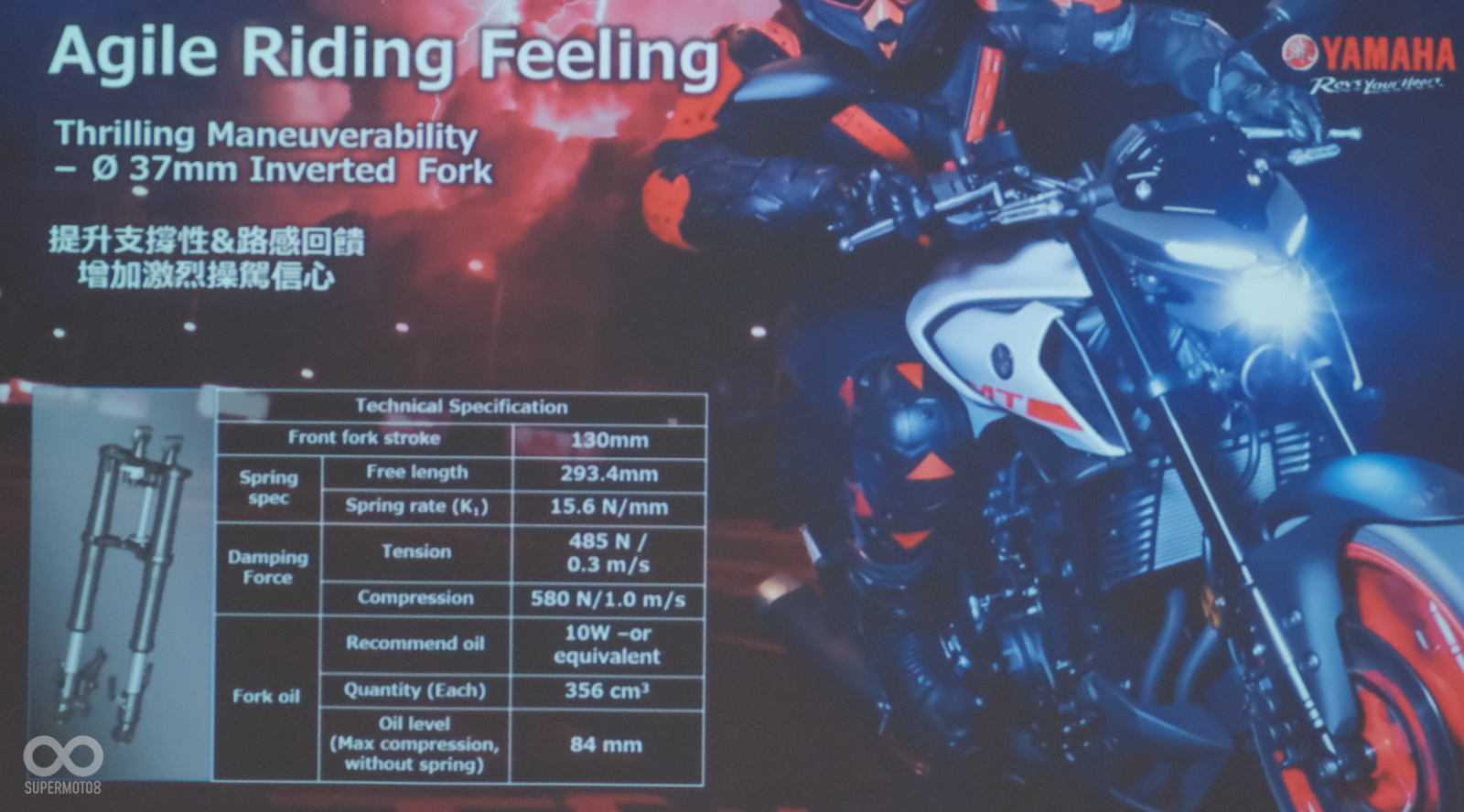 除了外觀變帥之外,MT-03這次在規格配備部分的升級,也是相當有感的,首先在懸吊部分,前叉換上KYB 37mm倒立式前叉;另外儀表部分,也從上一代的指針、液晶儀表搭配,改為LCD的全液晶儀表。