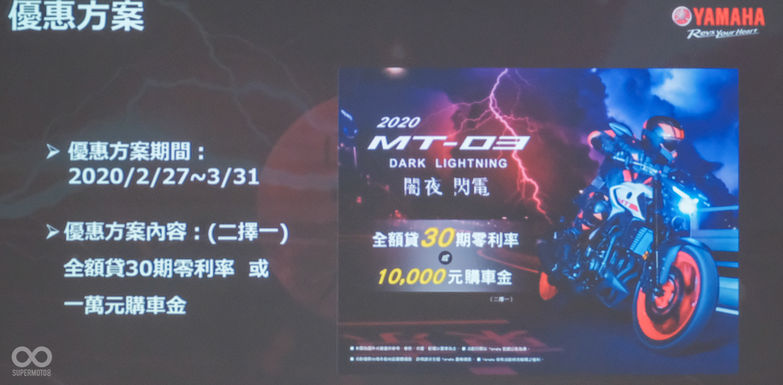 YAMAHA也將推出購車優惠,分別為全額30期零利率購車和一萬元購車金二選一的方案,購車優惠方案將持續到2020年3月底。