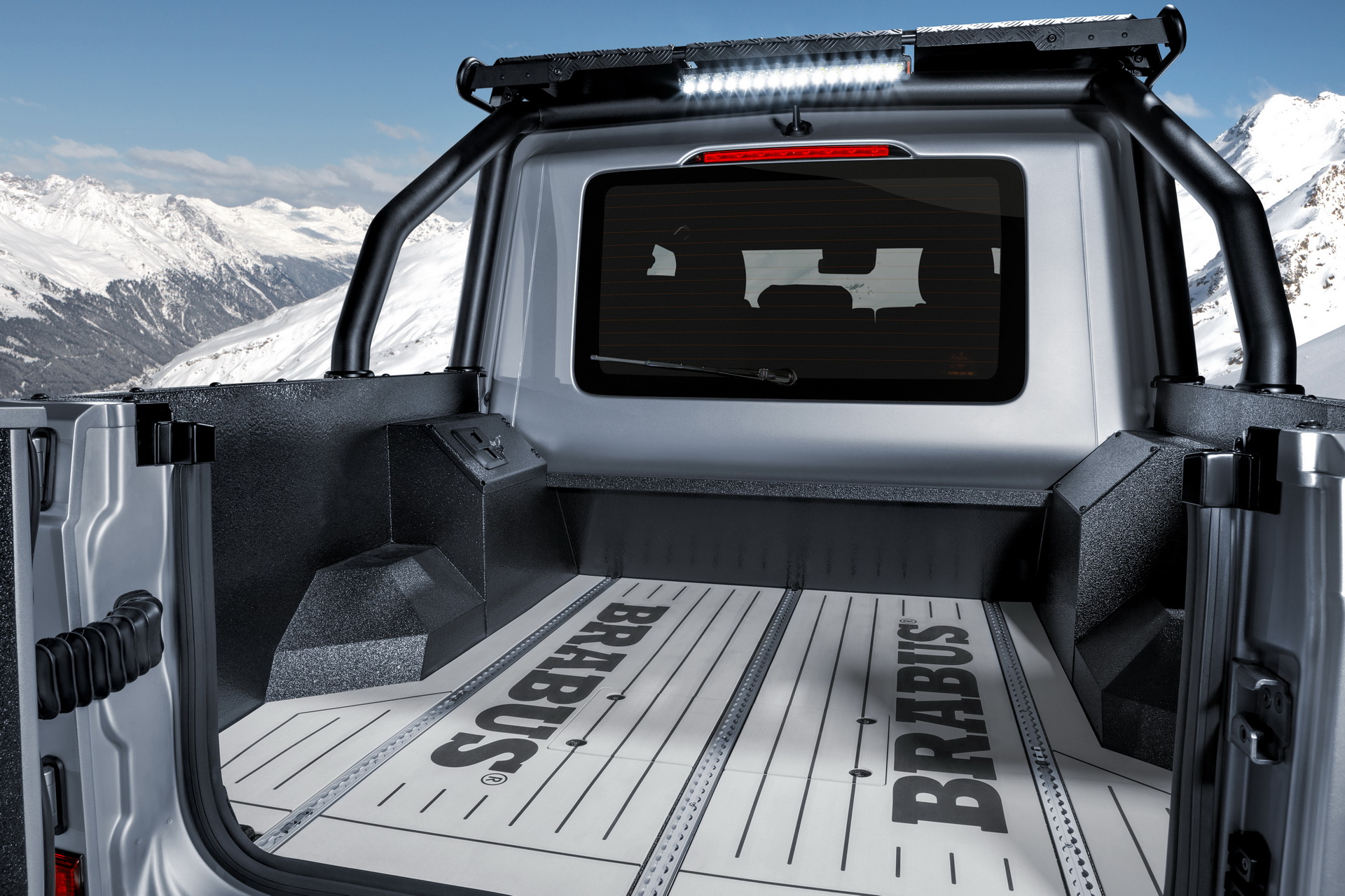 內裝當然也秉持著Brabus的豪華精神,運用了許多菱格紋的真皮包覆整個車艙,就連地板也是如此打造,讓人上車都不知道要不要脫鞋呢!而後方的貨斗也頗為精緻,原先後左與行李箱之間的空間用鋼板封閉,在貨斗內用上了防污塗料鋪設,上方粗壯的鋼條更顯這輛車的狂野本色,而車體四周的碳纖維套件則象徵著這輛車的性能風格。