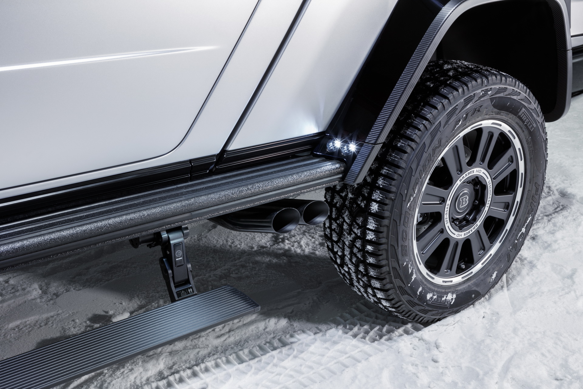 Brabus自行開發了底盤的特殊模組,在G-Class的梯形車架上延伸,把車長拉長了698mm,總長度來到5310mm,軸距也增加了500mm,在前方的獨立懸吊當中安裝了一個全新設計的副車架以及多個CNC加工的連桿,搭配上自家的主動懸吊系統,保持這輛車良好的操控特性,同時設置了新的門橋,讓離地高可以來到驚人的490mm。