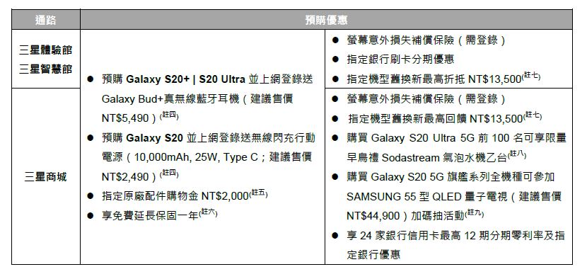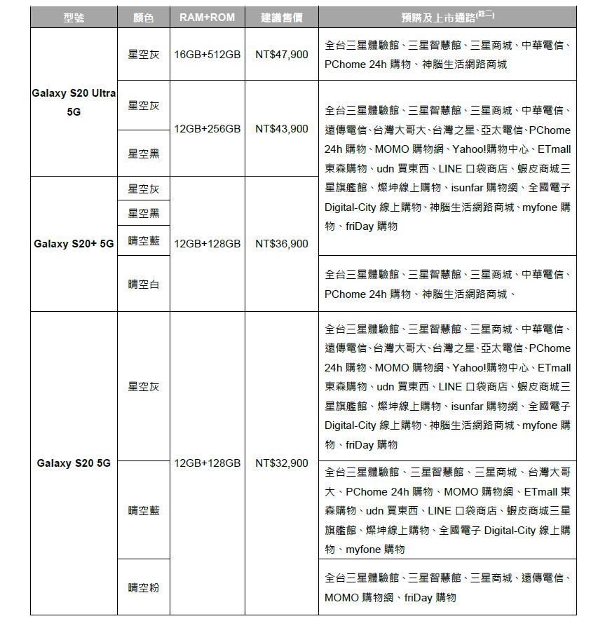 台灣販售規格除均採5G外,S20、S20+的容量均為12GB RAM+128GB、S20 Ultra則有12GB RAM+256GB 以及 16GB RAM+512GB 兩種容量版本。售價分別為32,900元、36,900元、43,900元、47,900元,即日起已可預購,3/20各大通路正式上市。