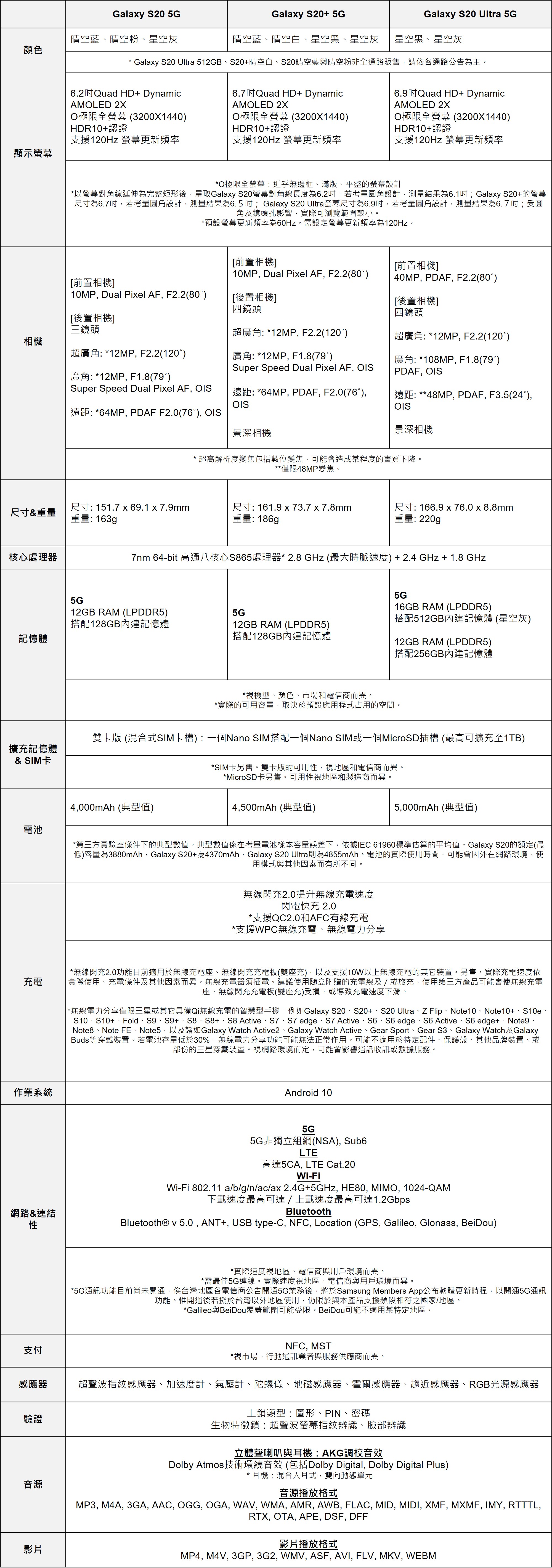 另外本次主打的拍照功能在三款機型的鏡頭數也有所調整。S20的主鏡頭為1200 萬畫素超廣角鏡頭(F2.2)、1200 萬畫素標準鏡頭(F1.8、OIS)、6400 萬畫素遠距鏡頭(F2.0、OIS),S20+則在多了景深鏡頭成為四鏡頭配置。