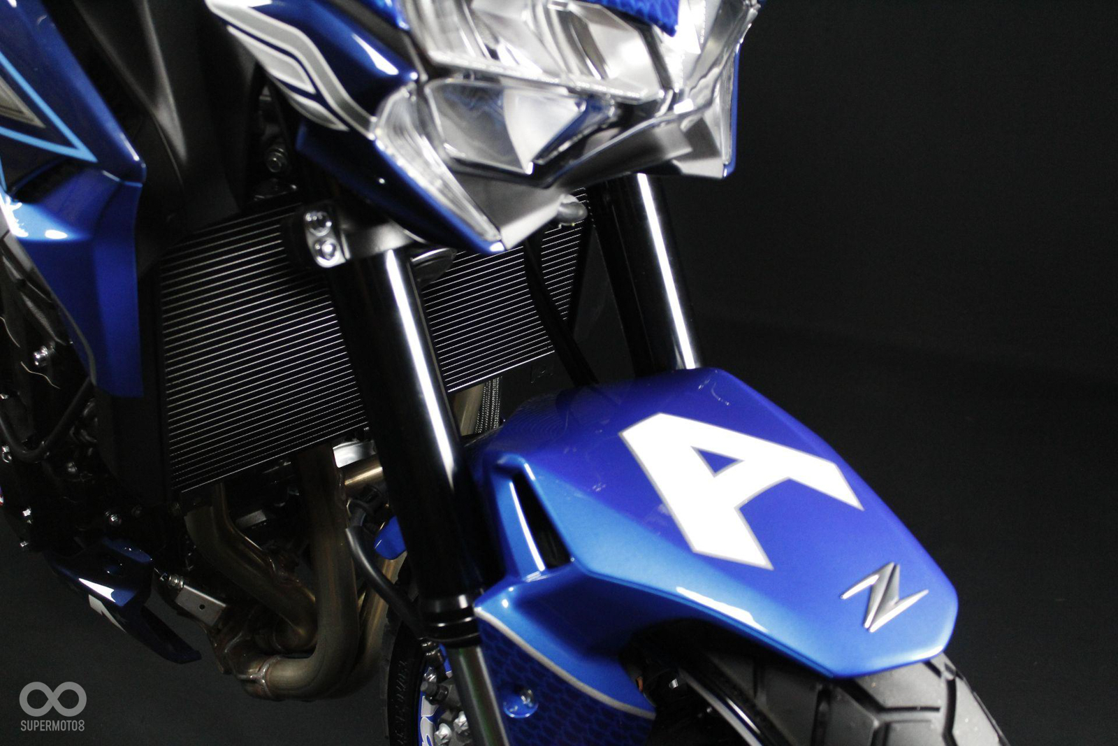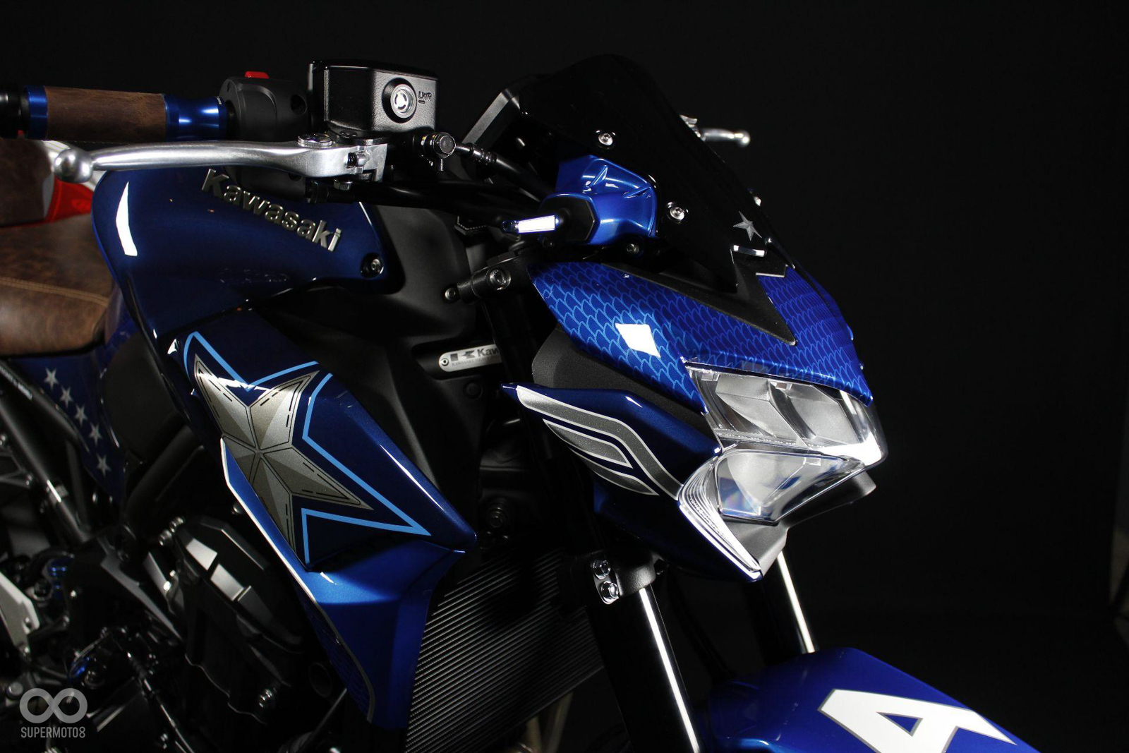 這輛美國味十足的Z900就是瑞士經銷商2-Rad Wehrli Belp的作品,全車塗裝以藍色、紅色、銀色為主,是否有讓你想起電影中美國隊長的服裝配色呢?為了彰顯這輛車的美國味,前土除上頭有斗大的A與Z搭配,適時提醒你這是量不折不扣的Z900。頭燈旁彩繪有著菱格紋點綴呼應電影中美國隊長服裝上的細節。