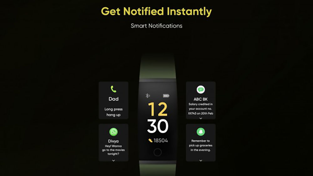 Realme Band 使用了一個0.96吋的螢幕,螢幕下方設有一個虛擬按鈕讓使用者可以輕易的透過他切換功能與顯示資訊,避免使用者在螢幕本體滑動手指擋住資訊的機會。此外手環上還加裝了一個感應器,使用者只要舉起手腕螢幕就會自動亮起並顯示時間資訊。