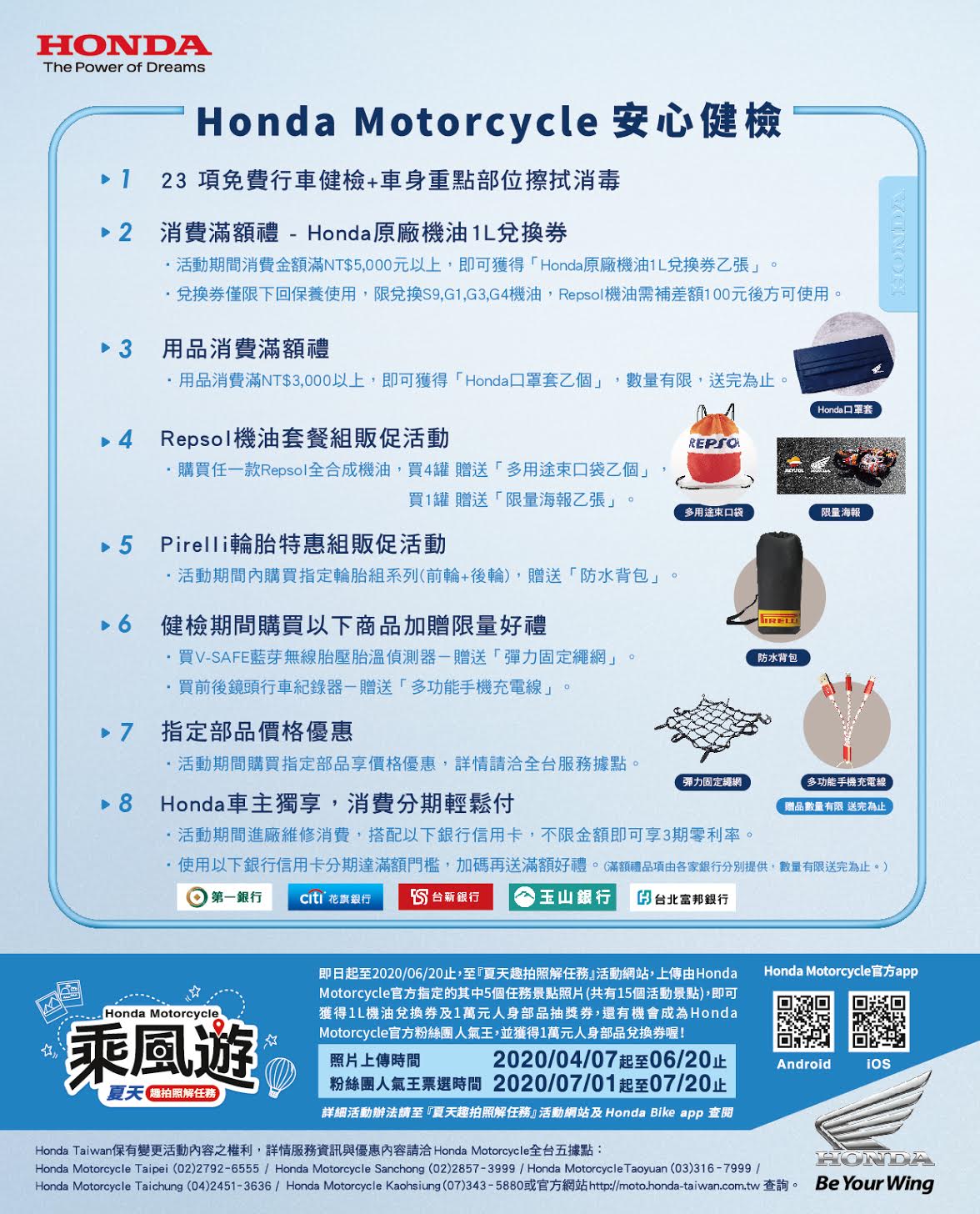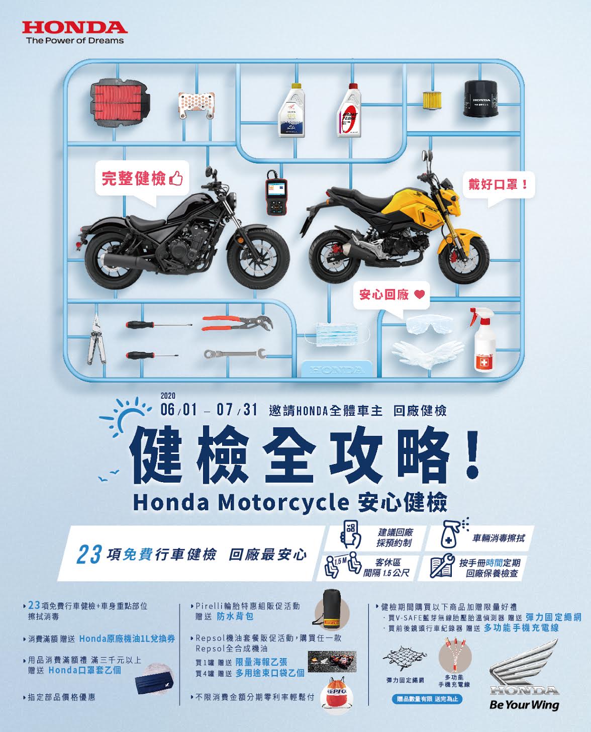 為讓親愛的車主有著更全面的服務,Honda Taiwan將於2020 6/1到2020 7/31於各區Honda Motorcycle經銷據點舉辦「健檢全攻略!」安心健檢活動,將提供免費23項行車安全檢查+車身重點部位擦拭消毒、消費分期輕鬆付、用品消費滿額禮等優惠,另外還有Repsol機油、Pirelli輪胎販促優惠活動等。