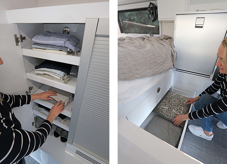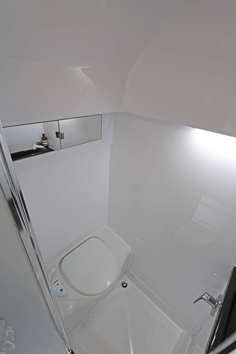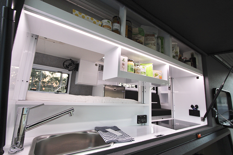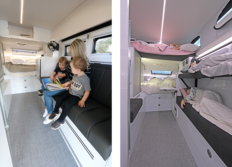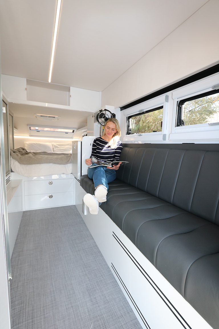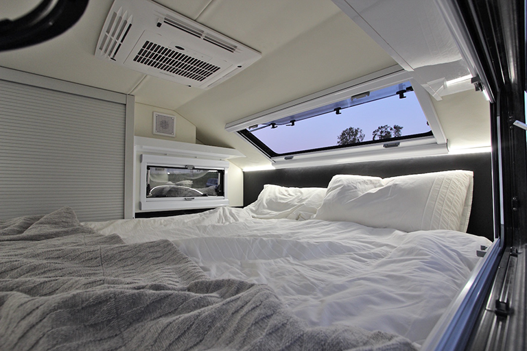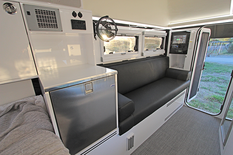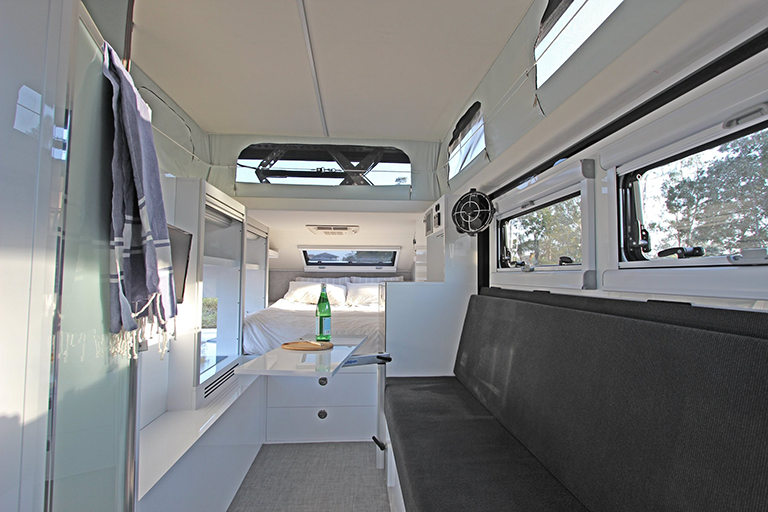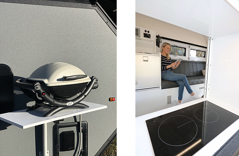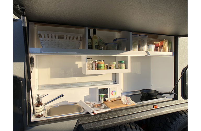 各個輪子上也都有獨立的雙減震筒設計,越野時的震動也會大大減少,內部最多可以擁有6個人的睡覺空間,睡覺時可以透過系統自動調節拖車的水平狀態,保證可以擁有良好的睡眠品質,而廚房系統則建置在外部的工作檯,有效利用了整體的空間機能,車輛還有著170L的大水箱設計,拿來洗澡可能不夠用,但已足敷飲食上的需求了。