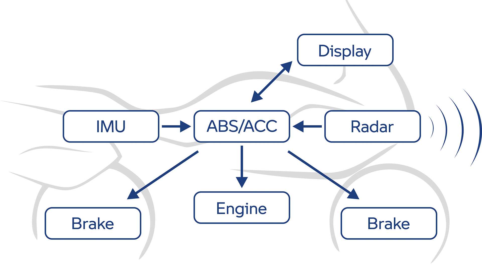 ACC主動式車距調節定速系統,是透過車頭的雷達或攝影鏡頭,來偵測自身車輛和前車之間的距離,並且按照騎士所設定的車距,主動調節車速跟著前方車輛巡航;當前方車輛減速時,騎士自己的車輛也會跟著減速;當前方車輛加速或切出車道,騎士自身的車輛則會跟著加速到設定的時速,對於長途巡航來說是一個非常便利、輕鬆的安全配備、功能。