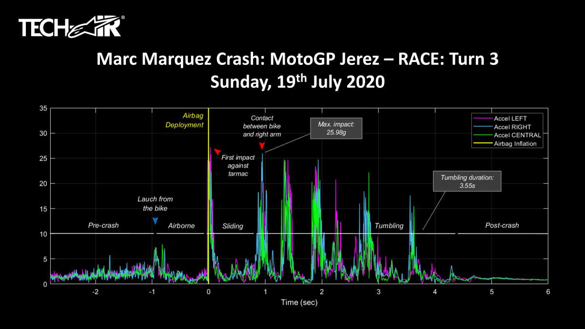 Marc Marquez 2020年MotoGP 7/19 首場賽事中,歷經嚴重的High side意外,造成右手肱骨骨折且缺席今年度第二場比賽,受惠於21世紀科技進步,在氣囊皮衣等安全裝配的防護下,Marc Marquez這看似驚人的摔車事件並無造成嚴重的傷害(雖然還是骨折了),而知名人身部品大廠,同時也是Marc Marquez身著的皮衣品牌Alpinestars,也在賽後公布摔車當下的數據。