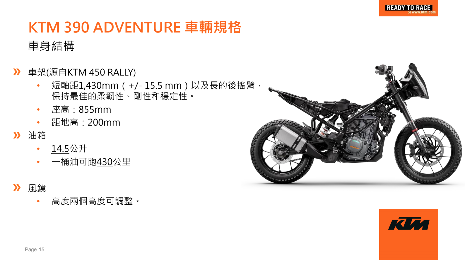 動力、車架部分,390 ADVENTURE的表現是可圈可點,引擎採用和390 Duke相同的373.2 c.c 水冷單缸引擎,擁有44 hp/9,000 rpm最大馬力和37 Nm/7,000 rpm最大扭力;車架源自於KTM當家的達卡拉力冠軍車450 Rally,超輕盈的158kg乾重帶來的操控體驗,不論是off-Road或on-Road都有強大的加分效果。