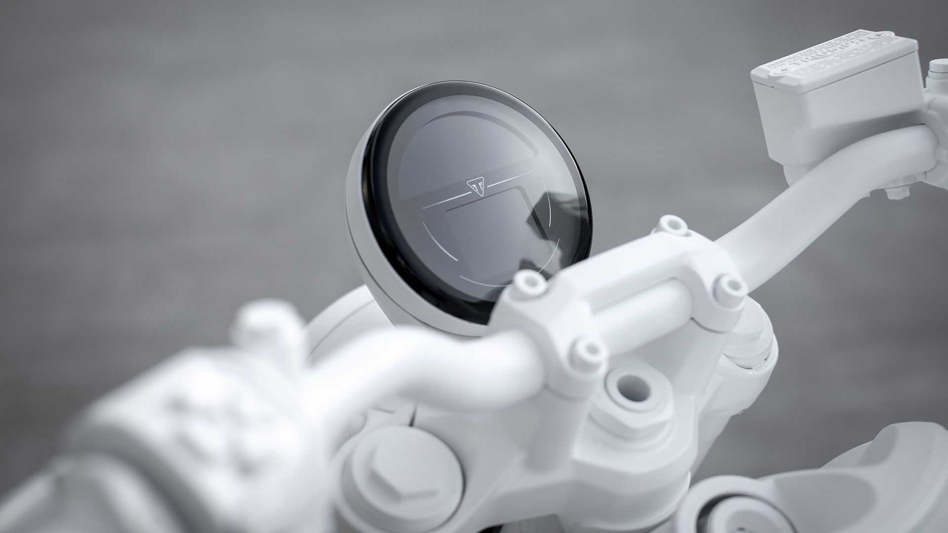 從設計原型車來看,TRIDENT確實和TRIUMPH目前當家的中量級運動街車Street Triple家族有著相當不一樣的外型設計語彙,首先是車頭部分,TRIDENT採用更有老味的圓燈配單錶設計,儀表部分筆者猜測是直接移植Scrambler 1200的現成製品。