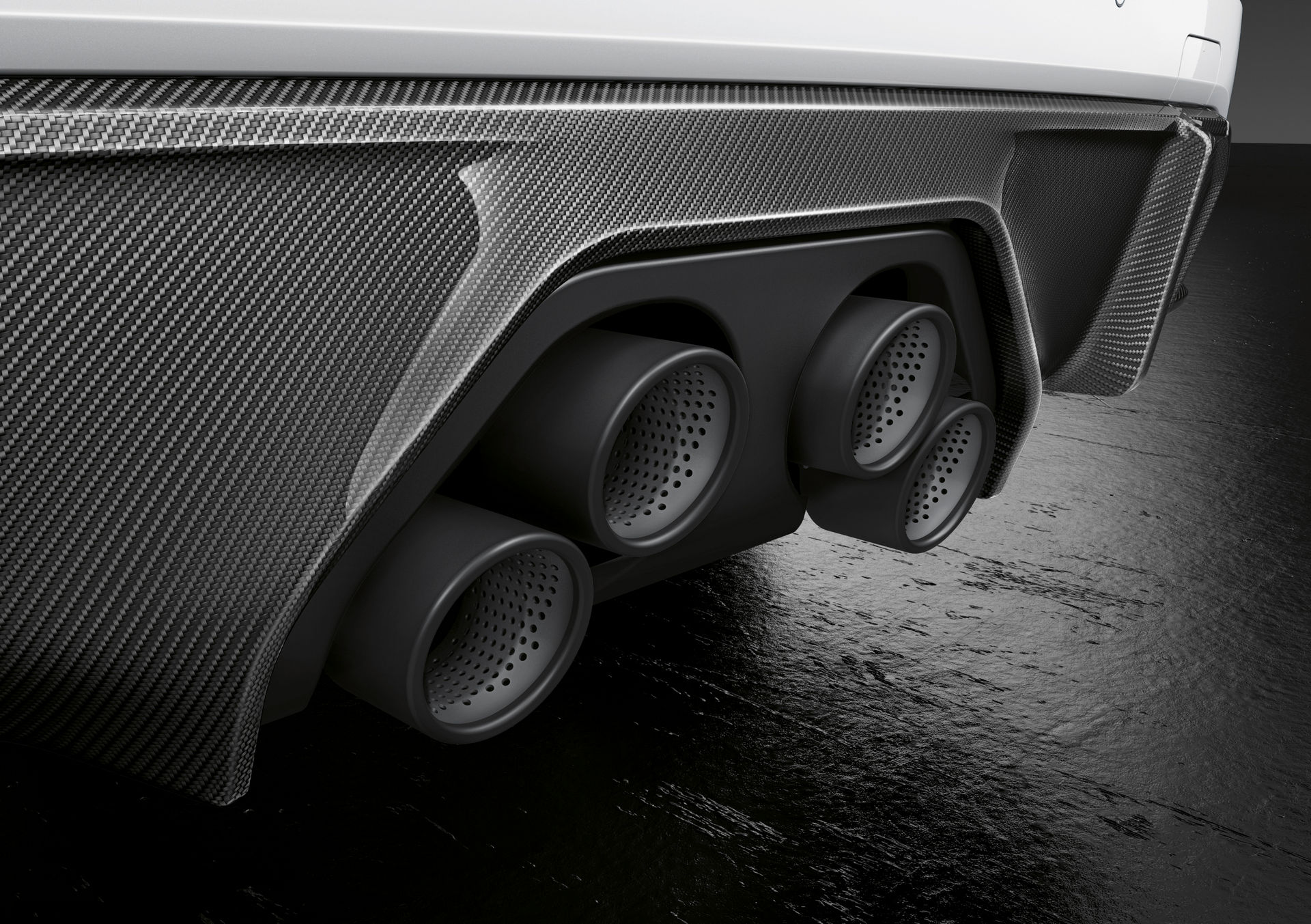 BMW將提供全新M3與M4將近三十種不同的M Performance性能套件,首先針對M3與M4的排氣系統做重要的升級項目,該系統在後方碳纖維擴散器中間改為中置四出尾管,與原廠的左右雙出有很大不同。從照片中看到實際安裝會有種震撼感,這是BMW性能車款很少出現的排氣布局,我們大膽假設,這樣的配置會相同轉移在M4 GTS進階性能車型上。BMW表示,這組排氣系統採用鈦合金打造,並且具閥門可隨時控制排氣聲浪與暢通性。
