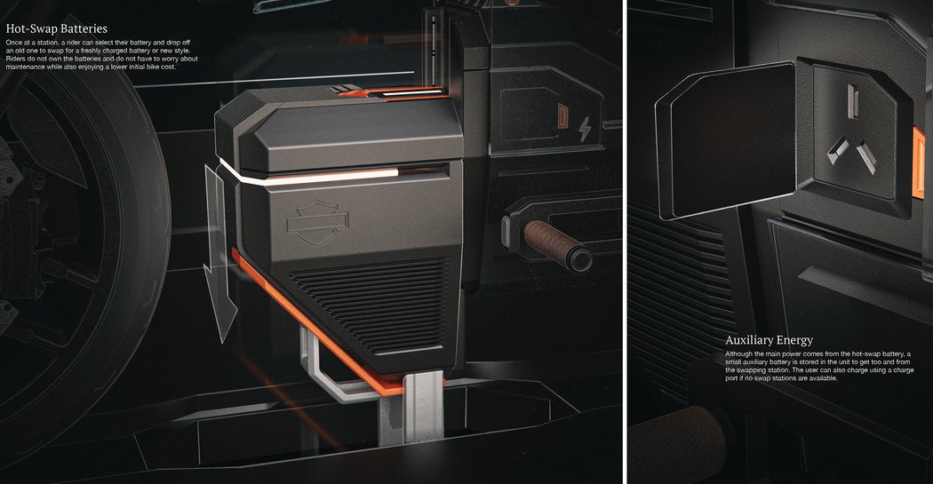 這輛車的重心更低一些,但是座高並沒有降低,在可調整的踏板設計下,騎士會獲得最舒服的姿勢,真皮的把手呈現出高質感氣息,簡約的儀表更是吸睛,並且搭配上諸多LED燈條的妝點,整輛車有著現代化工業風格,而且這輛車比起今日的哈雷都還要來得更小一些,緊湊的身型會方便在都會區使用,同時配置了可抽換電池系統,實用性更高。